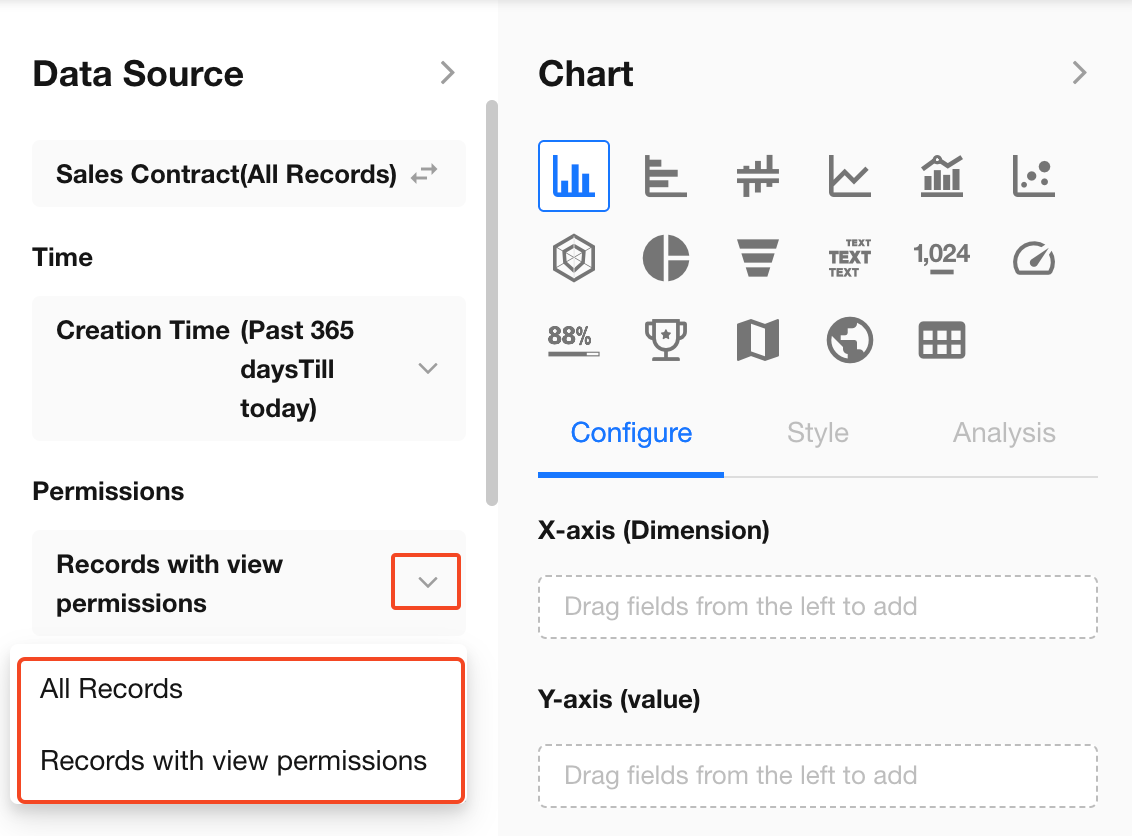 - Records with view permission (default): Users can only analyze data they have permission to view