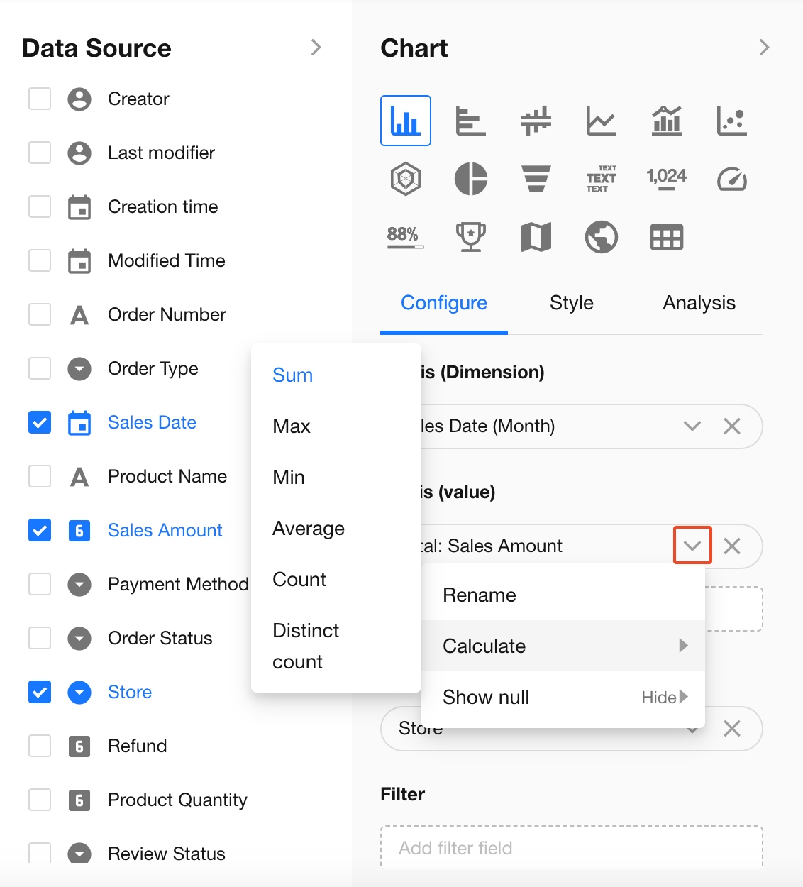 - Metric (value): The numerical value to calculate (e.g., sales amount, order count, number of users)