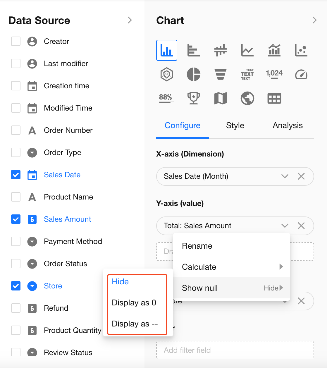 When the Y-axis result is empty, you can define how null values are displayed: Hide, Show as 0, or Show as "-".