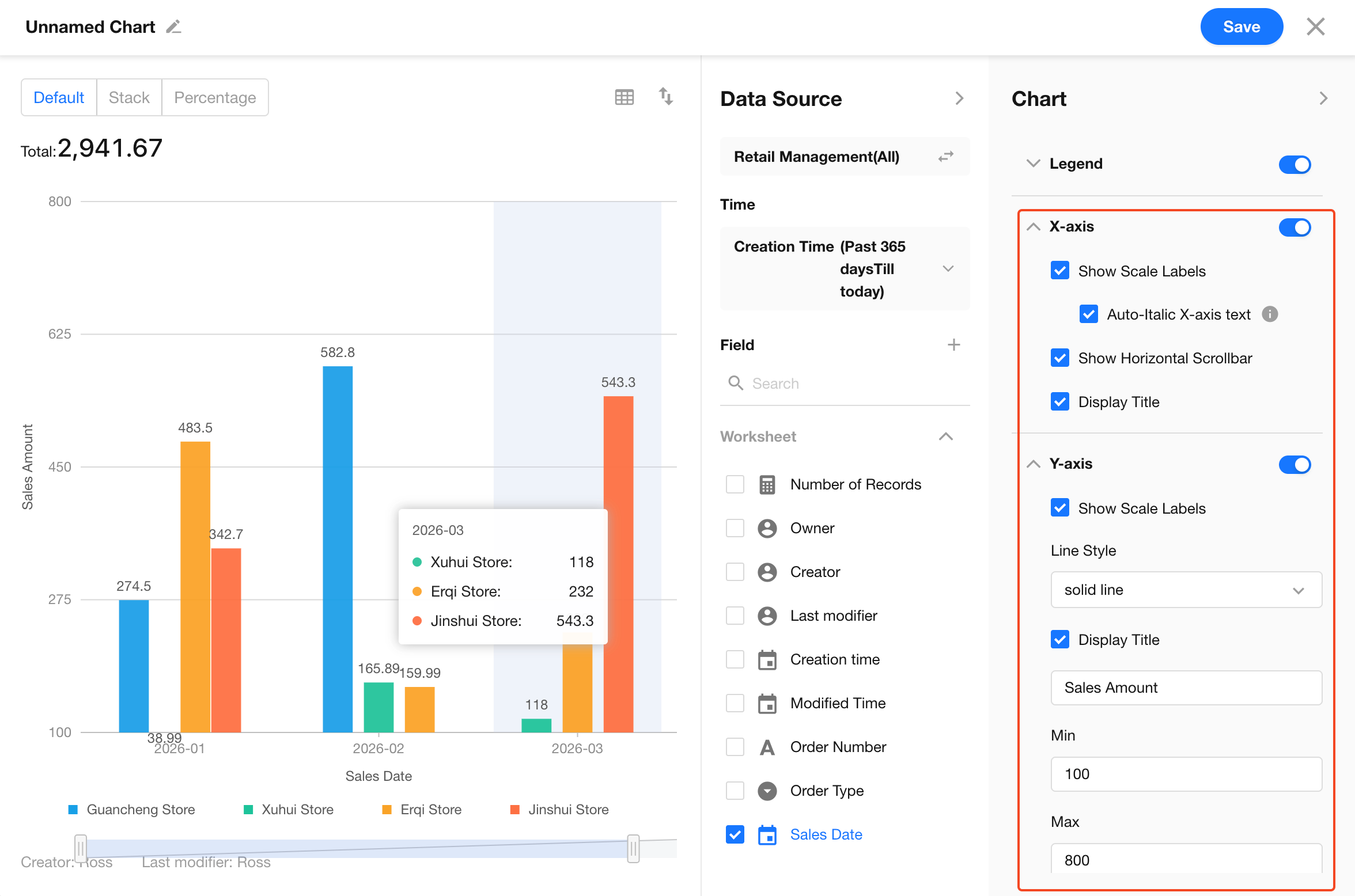 Set X-axis to “Sales Date” (grouped by month) and grouping to “Salesperson” to compare performance across different months.