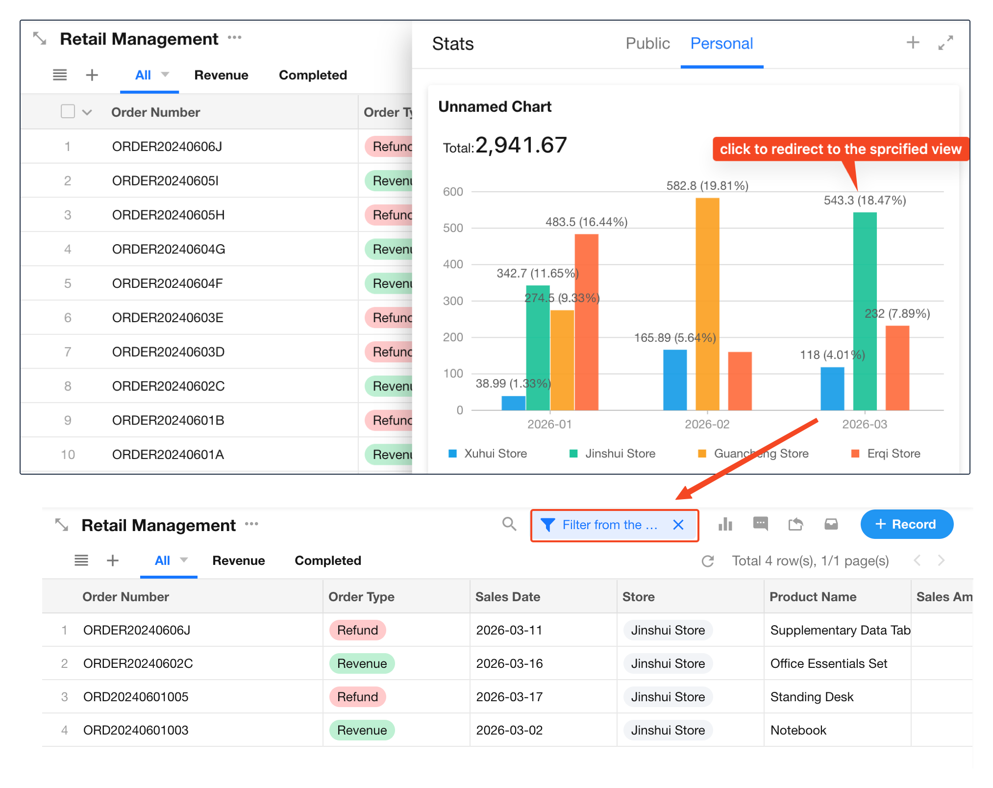 When enabled, users can click a chart element (e.g., a bar or slice) to view the underlying records.