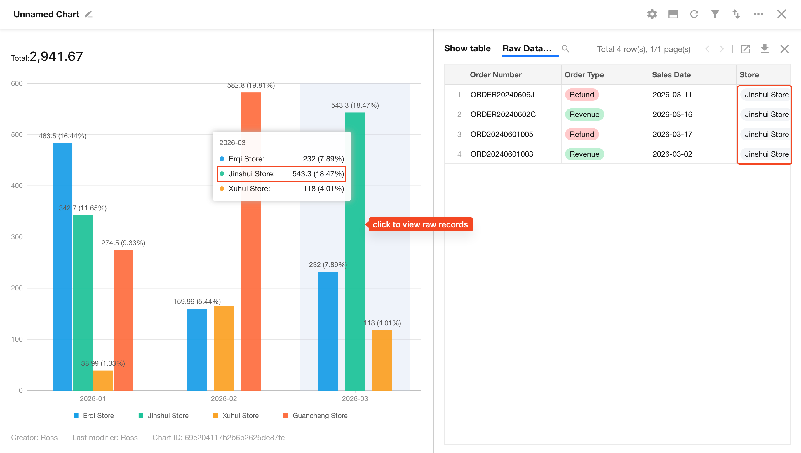After saving the chart, click a chart element in view mode to access raw data.
