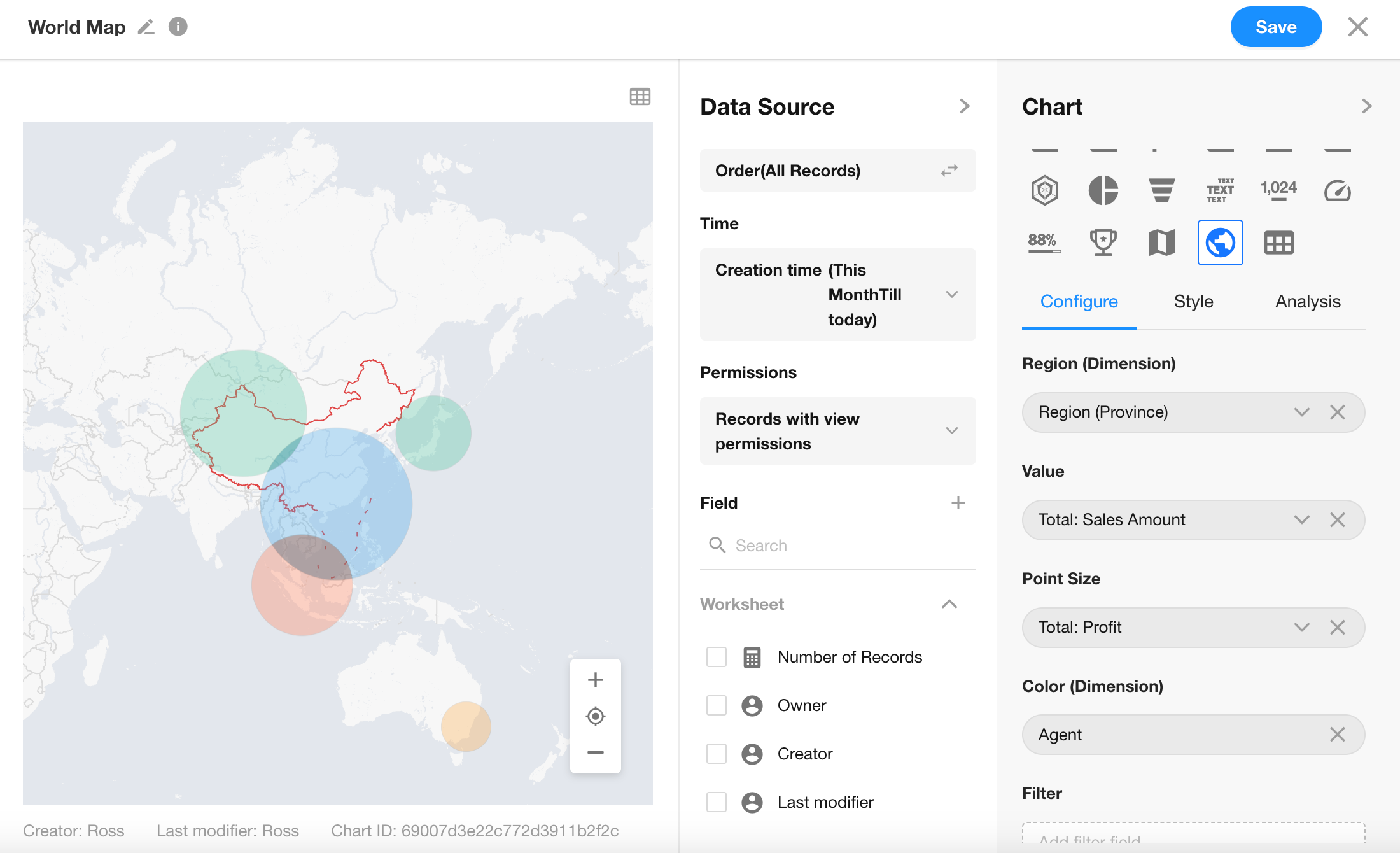 It maps geographic locations (countries/regions/provinces) to coordinates, bubble size to represent a numerical metric (e.g., order volume or profit), and bubble color to differentiate by category (e.g., agent type). This chart is ideal for visualizing global agent distribution, regional performance, or market intensity.