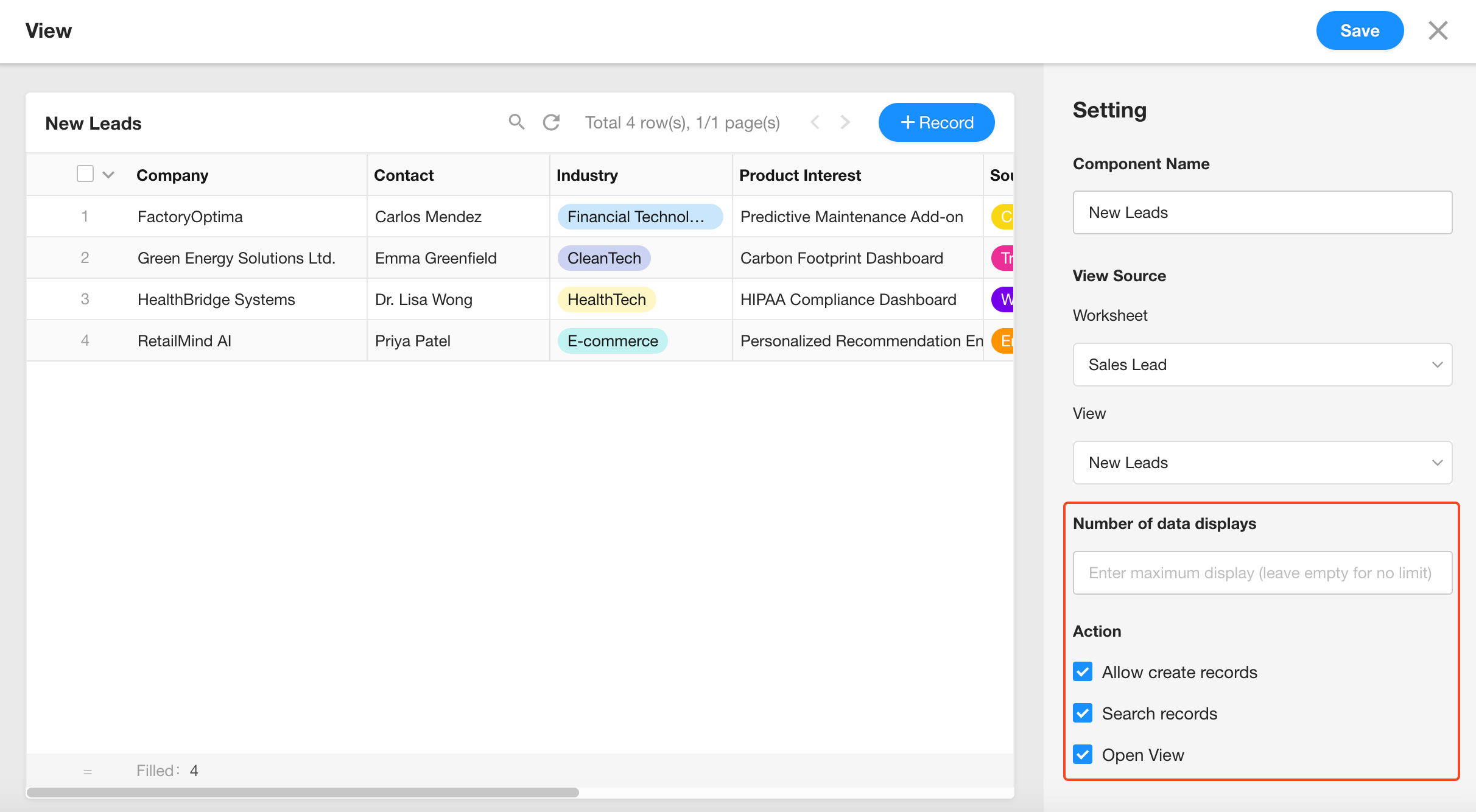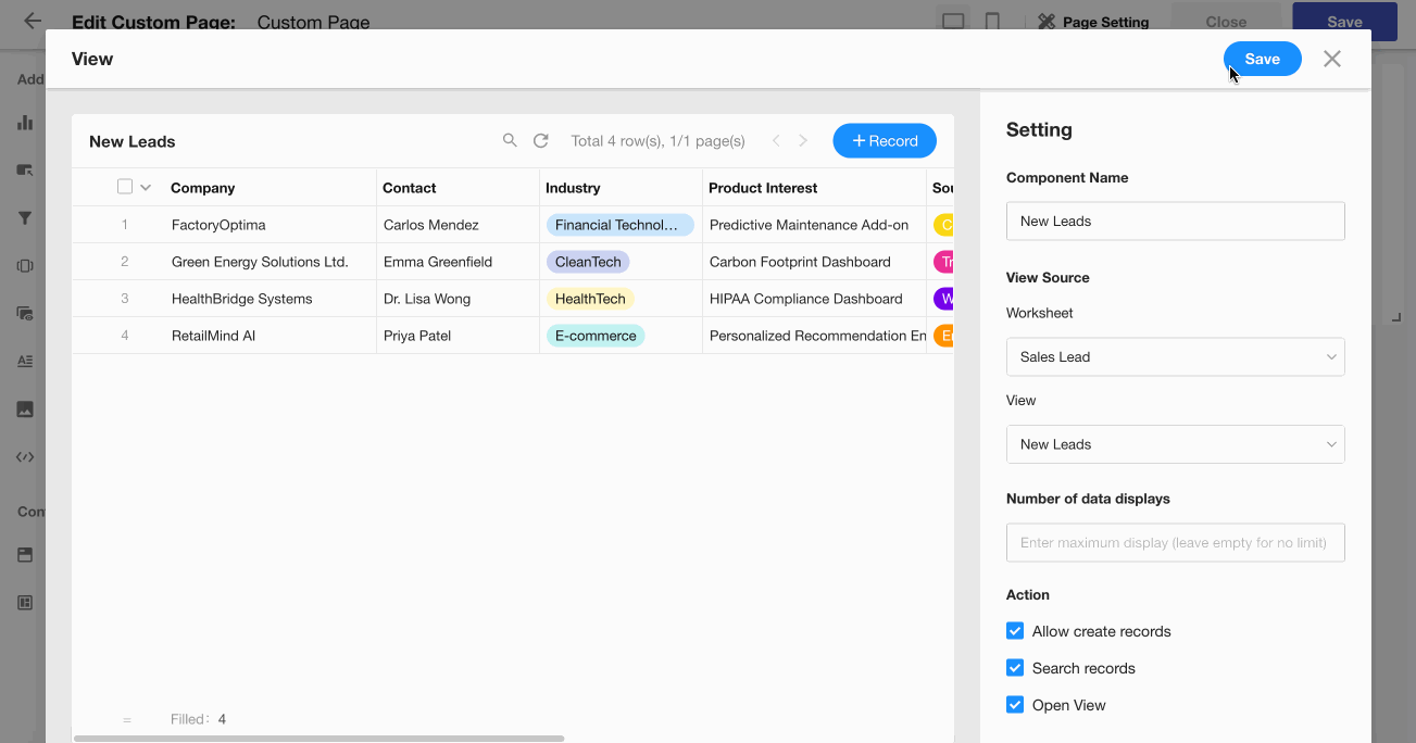 Example: Embed the “New Leads” view from the Sales Leads worksheet into the custom page to help sales reps assign and follow up efficiently.