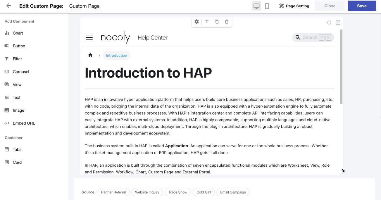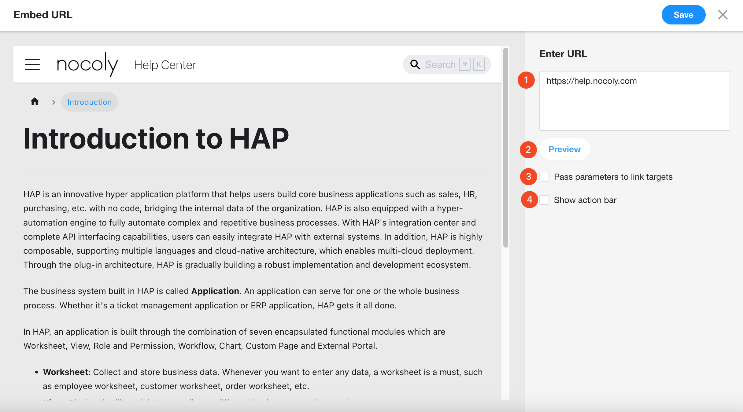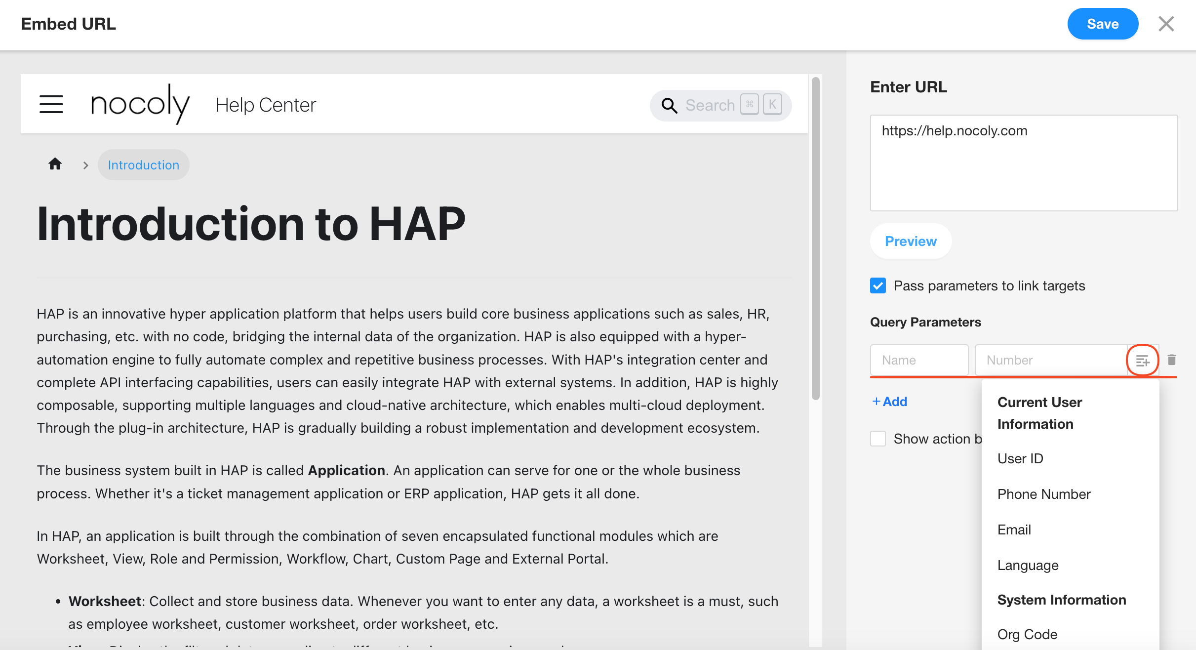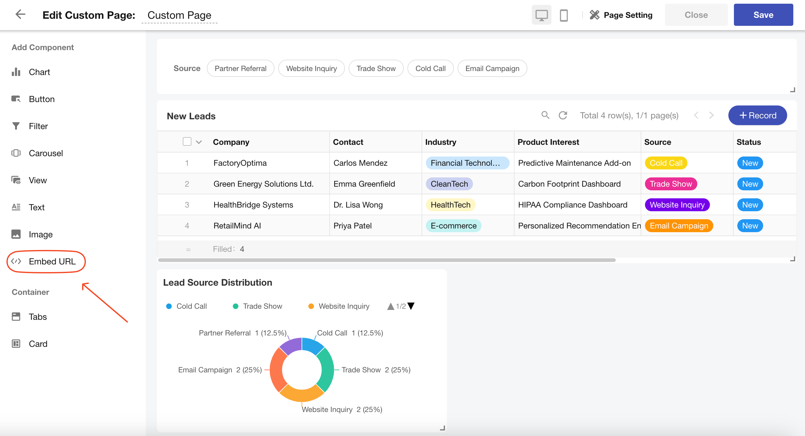 In a custom page, you can embed an external system page, or even embed a specific view from within the platform.