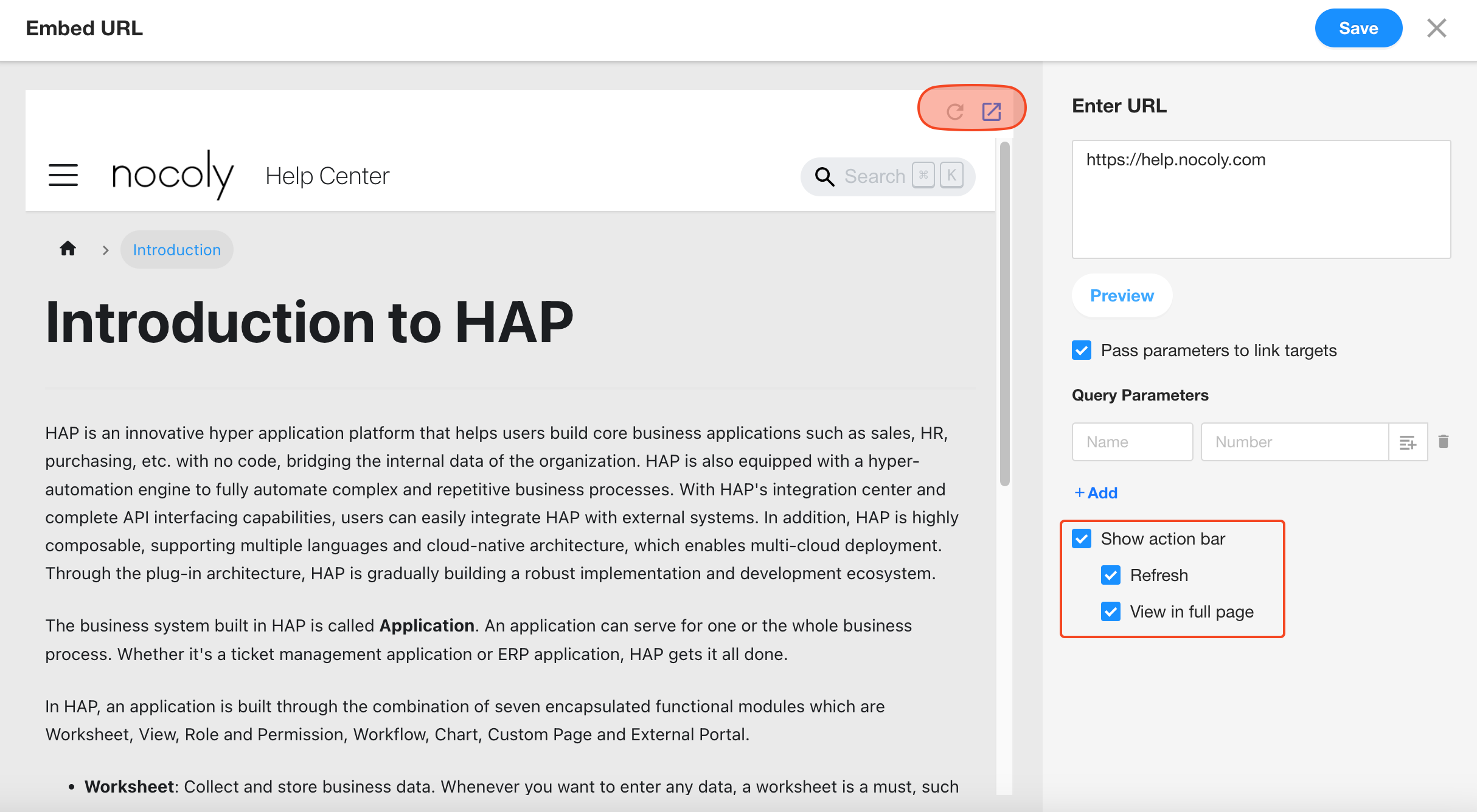 If enabled, a toolbar will appear at the top right of the embedded area, with options to Refresh and Open in New Tab.