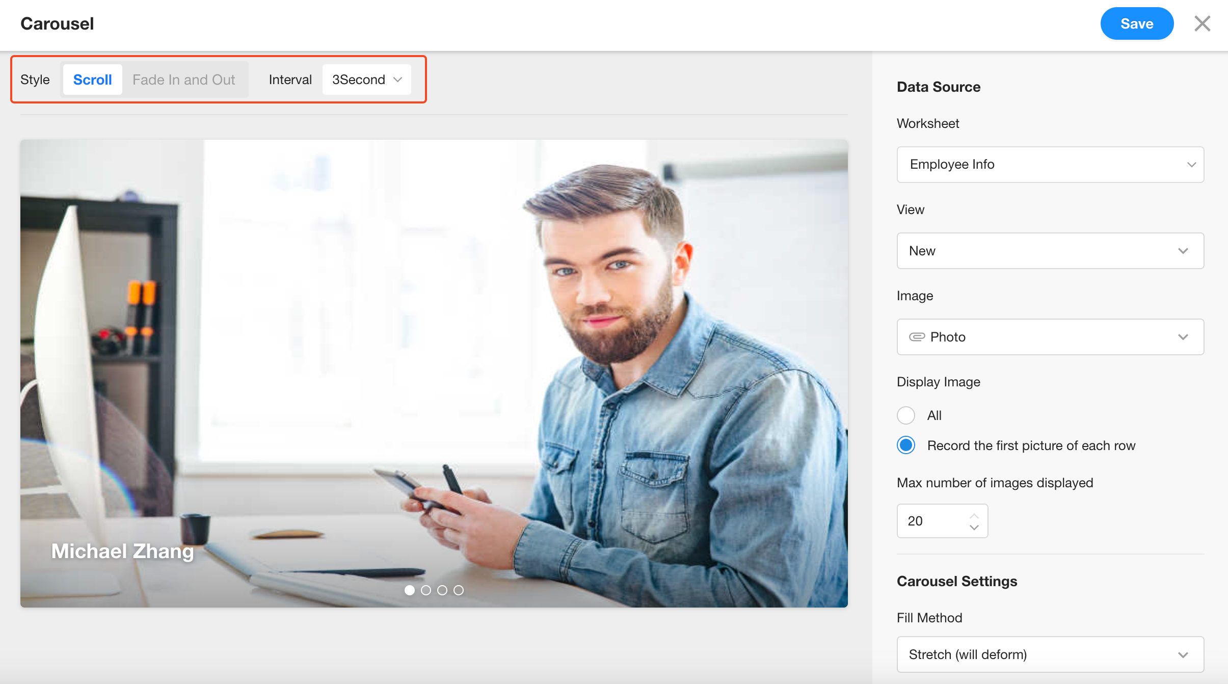 The carousel component allows you to loop through images stored in records. Each image can include embedded links or descriptive text. Carousels are commonly used for showcasing and promotional purposes. For example, display newly onboarded employees from the past 30 days: