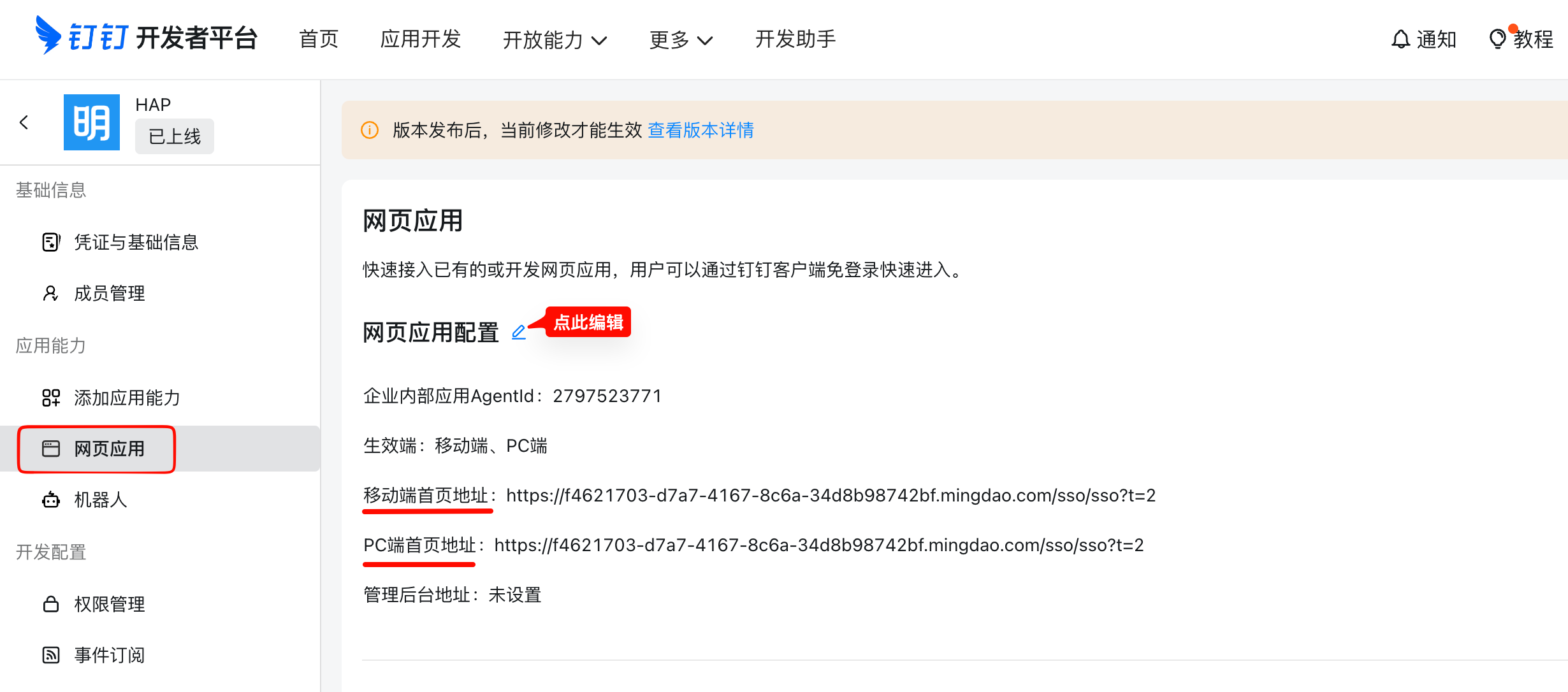 在钉钉管理后台安装一个微应用,建立钉钉和HAP的信息对接。