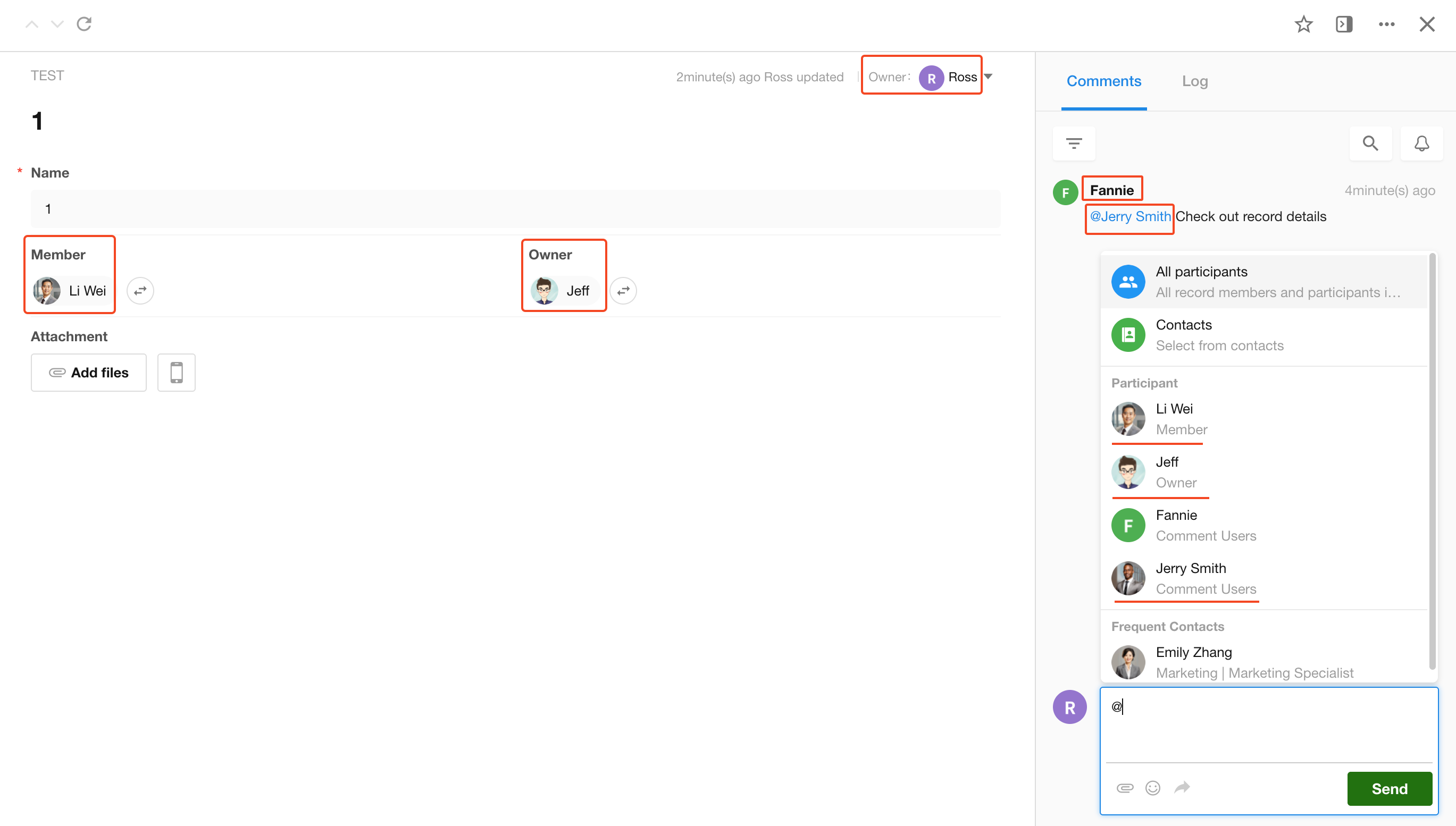 When mentioning someone in a record discussion or when adding members, a list of frequently collaborated users will appear.
