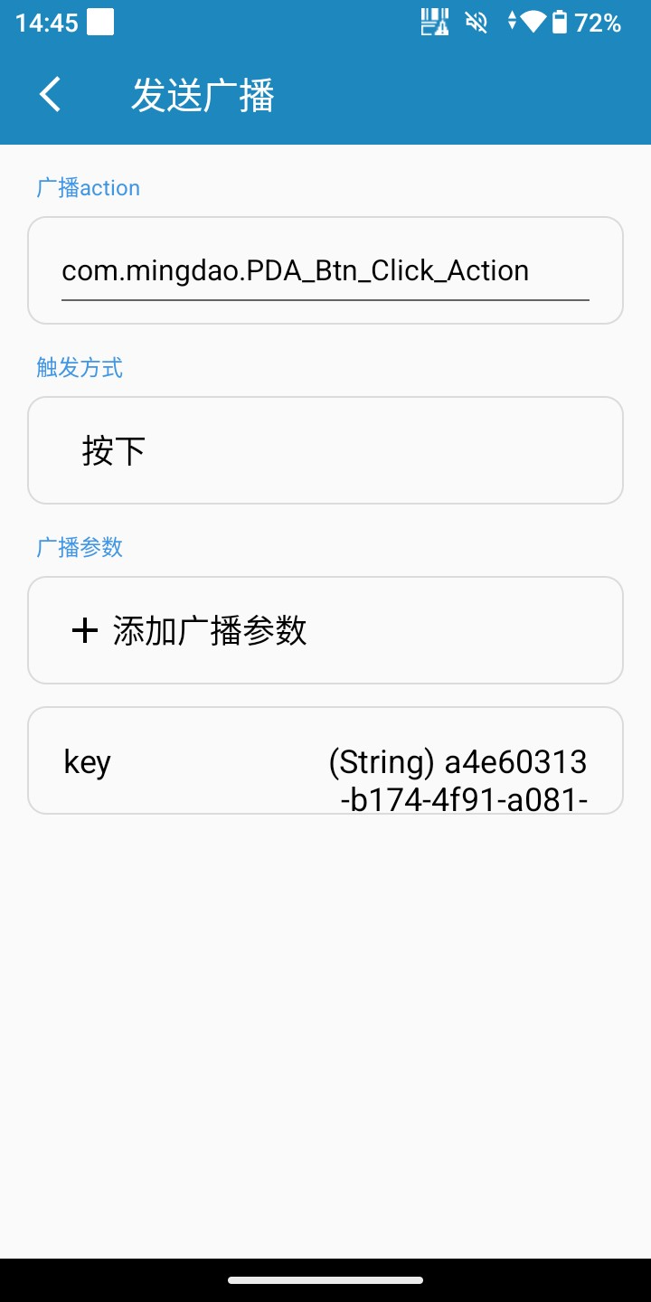按键设置中配置发送广播模式,广播 action的值为:com.mingdao.PDA_Btn_Click_Action