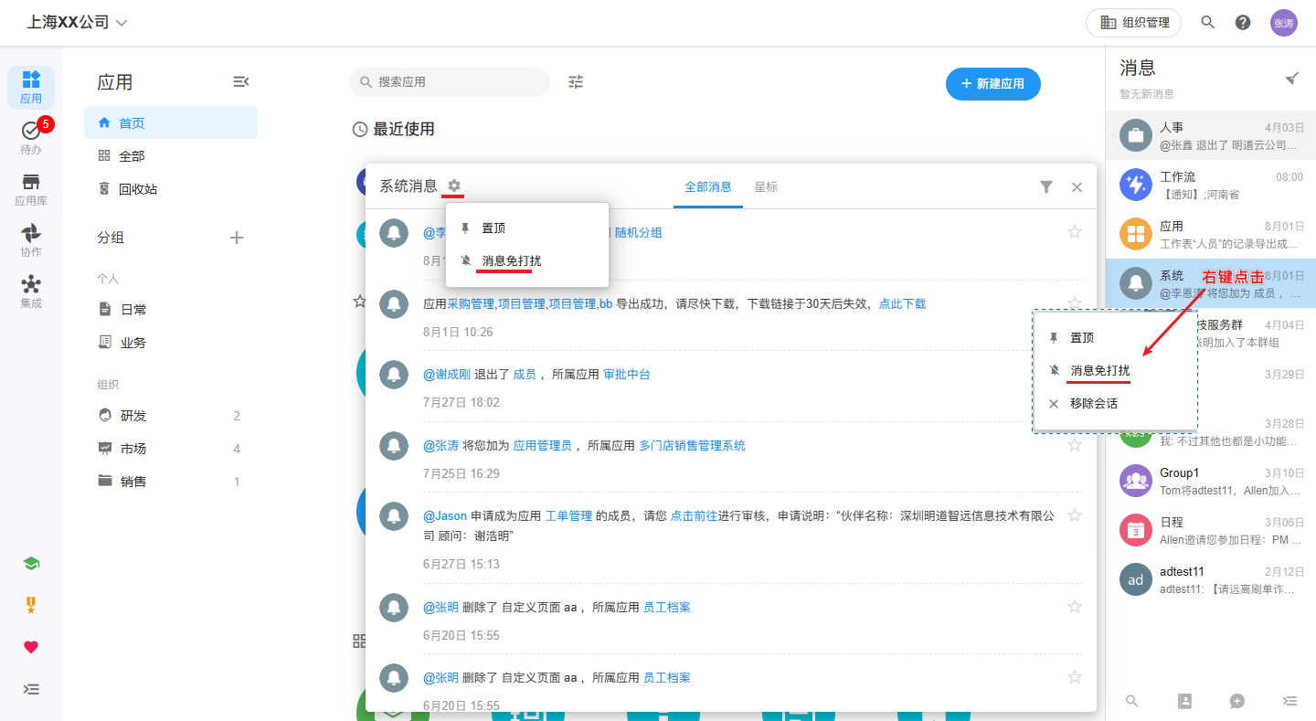 On this page消息免打扰 开启或关闭免打扰 开启免打扰 开启提醒 免打扰效果 设为免打扰后,新消息只显示红点,不发通知提醒(包含标签闪烁、提示音、手机推送)。 回复你、@你的消息正常提醒。 系统消息、知识、人事、群组:全部不提醒 工作流: 全部不提醒,包括审批、填写、抄送、站内通知。 应用: 除回复本人、@本人外、@记录全体成员外,其他消息不提醒 动态: 除直回复本人或@本人外,其他消息不提醒,@所在群组@动态参与者都不提醒 日程、任务: 除回复本人、@本人外、@全体成员外,其他消息不提醒