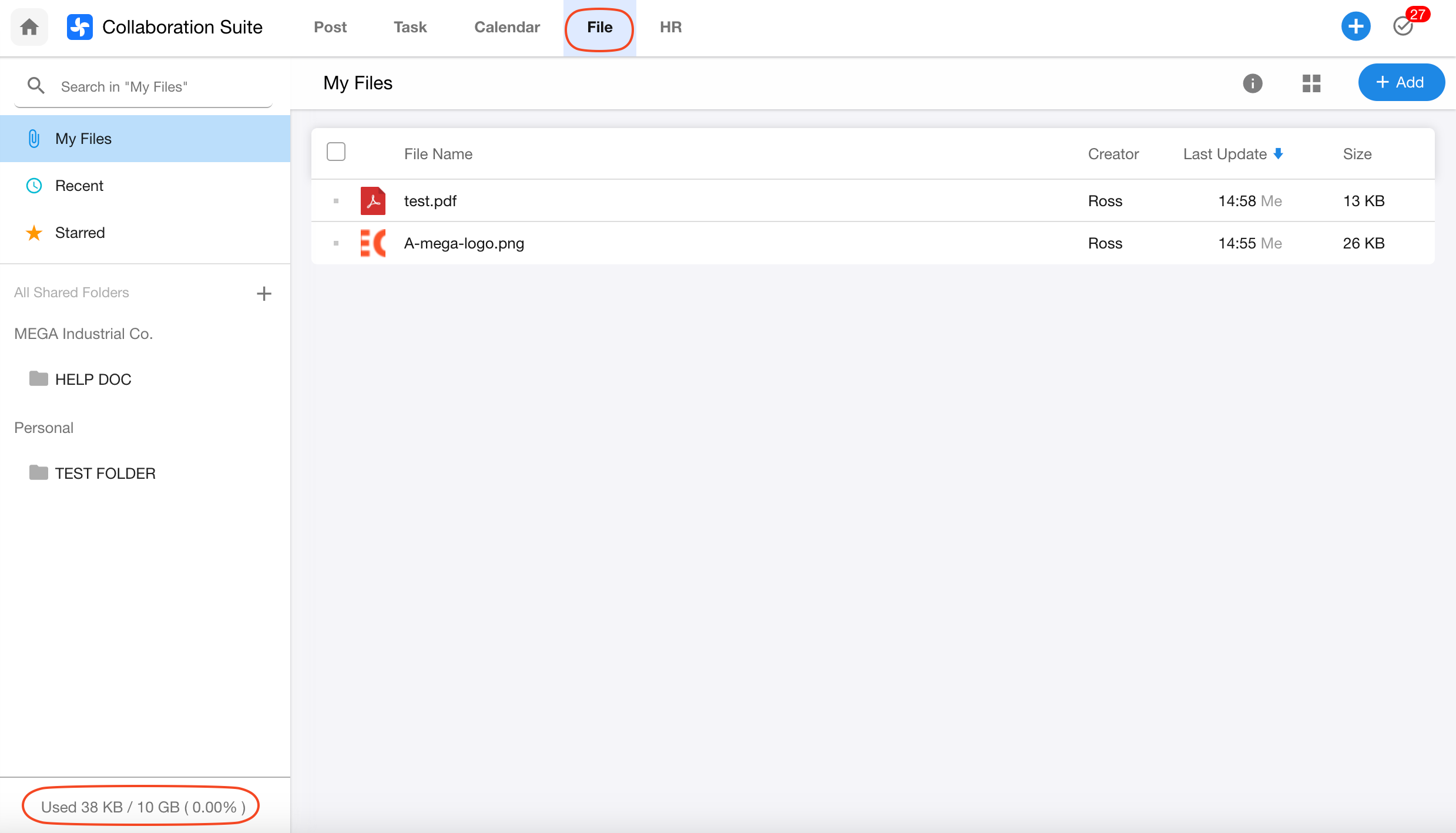Attachments uploaded in Post, Task, and the File module all count toward your storage usage.