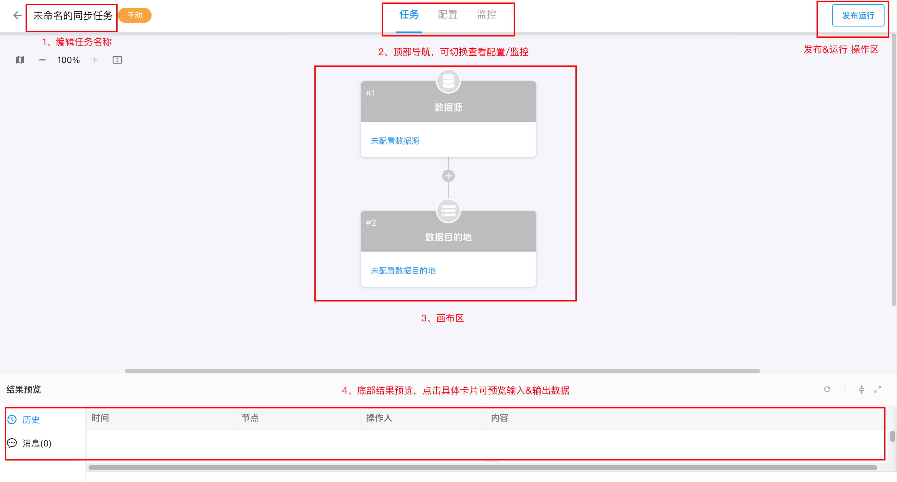 点击页面上的「+同步任务」按钮,弹出选择类型弹窗,选择一种任务类型,该任务的详细配置界面,也称为任务画布,以下为界面逐区说明: