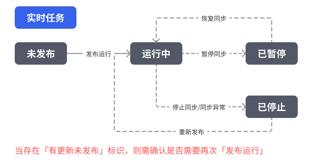 手动同步: 由用户手动触发执行的同步。创建任务后,只有在用户点击“发布运行”或“发布”按钮时,系统才会启动数据同步过程。适用于一次性或临时的数据迁移和测试场景,例如将旧系统 数据批量导入平台或对数据更新进行验证等。在手动同步中,每次都需要用户主动启动任务,系统并不会自动运行。