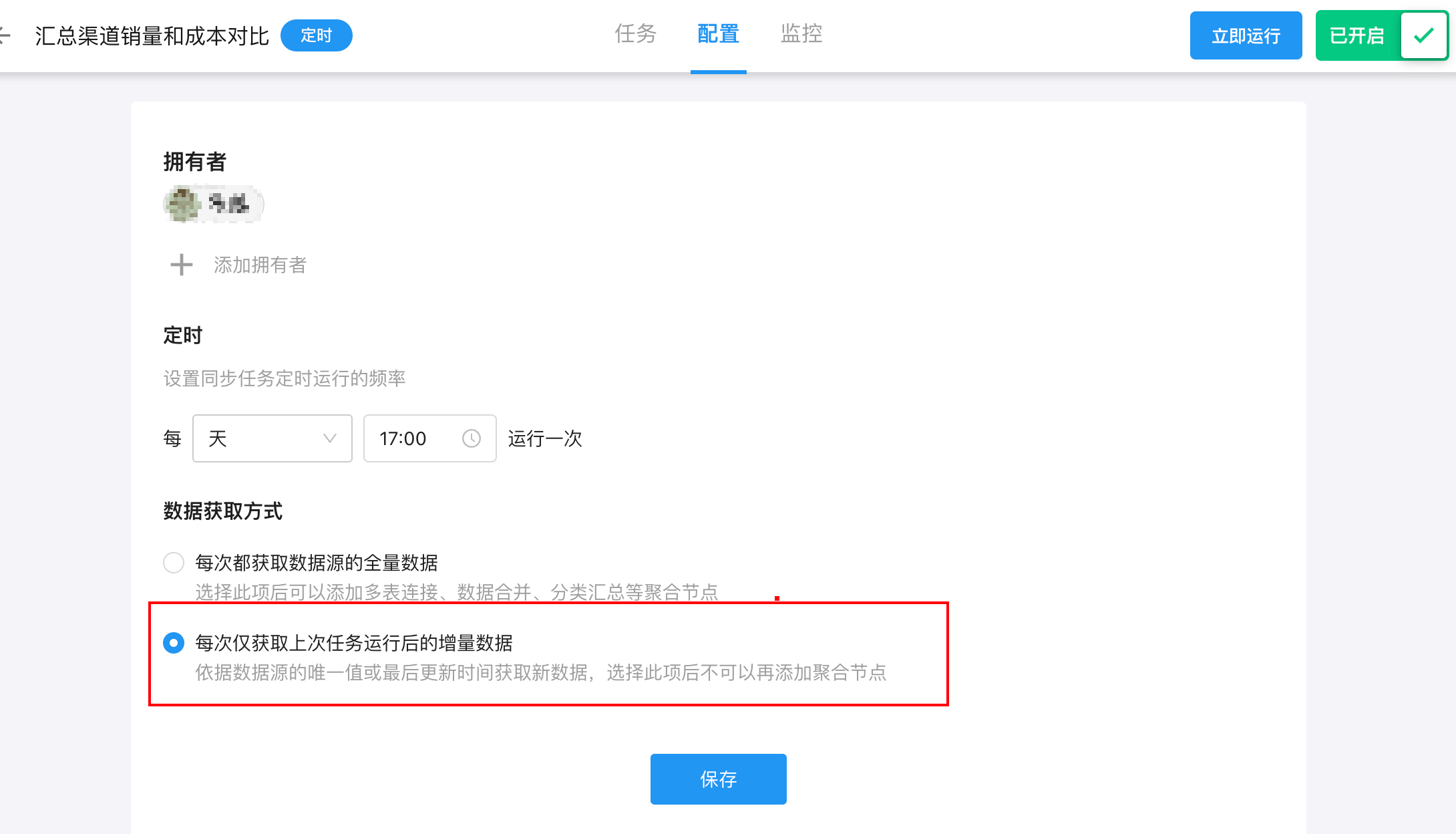 定时同步: 按照预先设定的时间计划自动运行的同步。用户可以在任务创建后点击“开启定时”按钮,根据提示设置同步频率(比如每小时执行一次,或每天固定时间执行)。设定好后,系统会在指定时间自动启动任务,无需人工干预。适用于需要周期性更新的数据场景,比如每天凌晨同步新订单数据或每小时同步销售数据等。