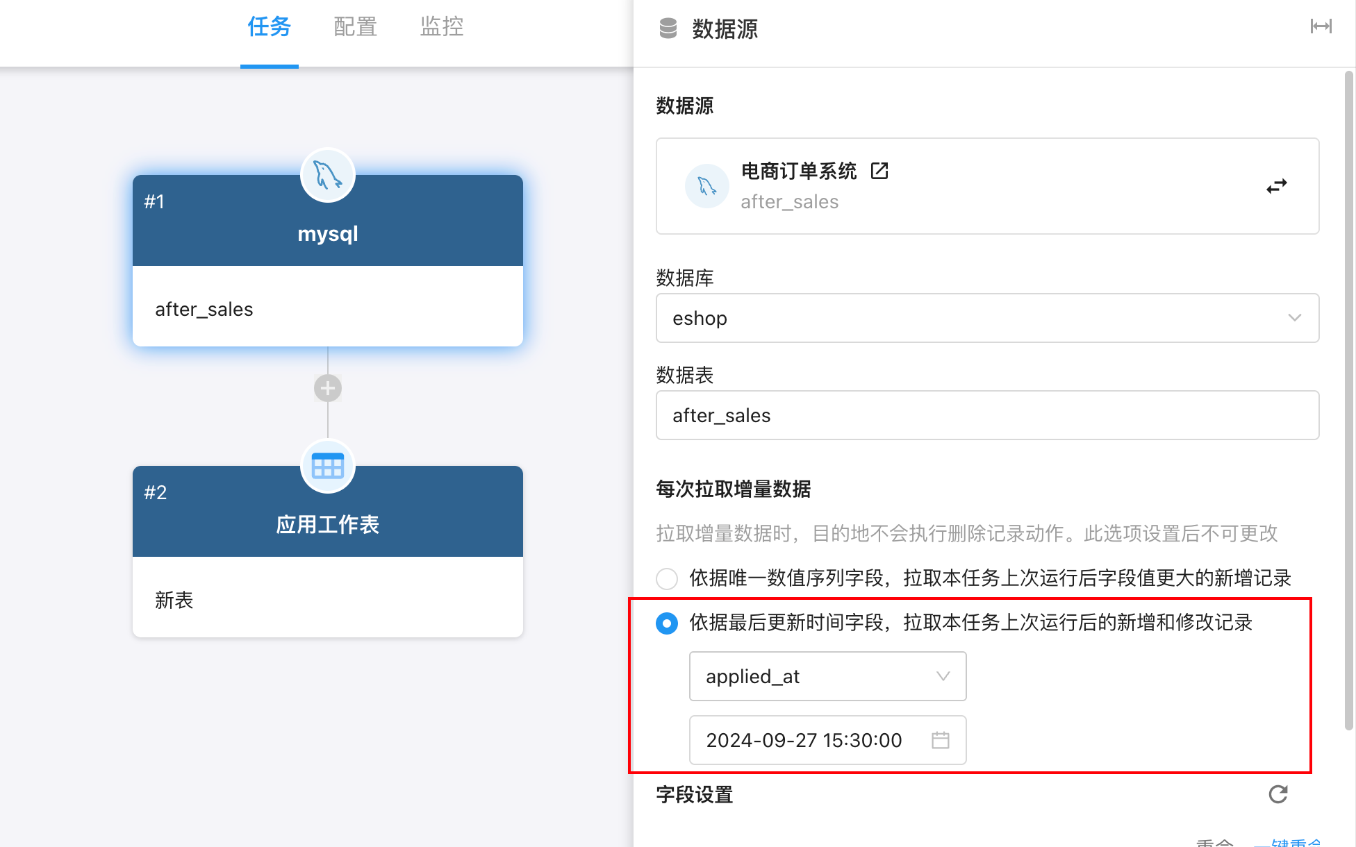 实时同步: 数据源一旦发生变化,系统就会尽快同步更新,无需等待定时调度。实时同步方式能够保证数据几乎同步更新,适合对时效性要求高的场景,例如自动将业务系统中新增或修改的记录及时同步到数据仓库或工作表中。 通过选择不同类型的同步任务,用户可以针对具体需求选择合适的模式。