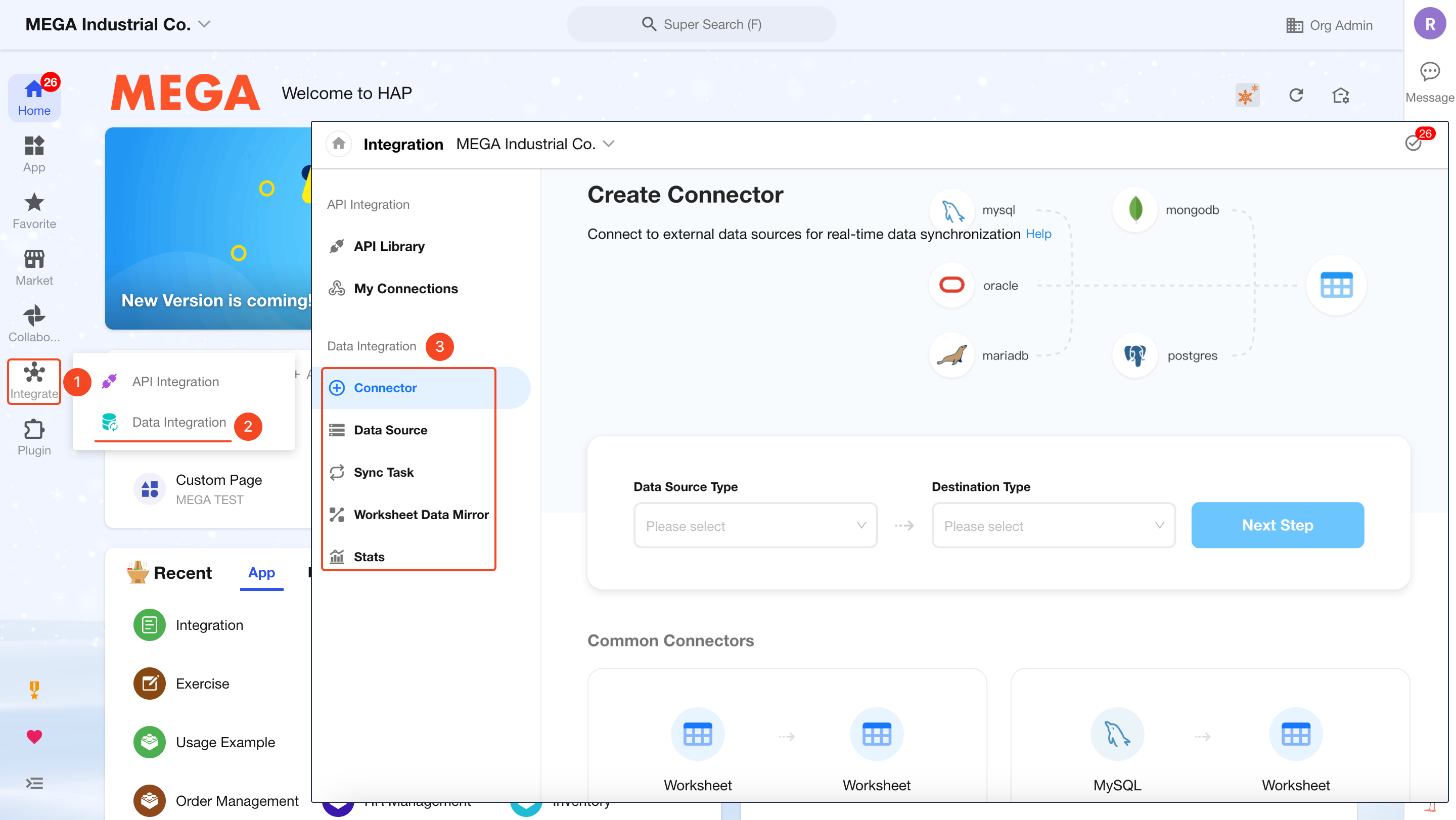 Navigate to [Integrate] in the left-hand menu from the home page to enter the Data Integration module.