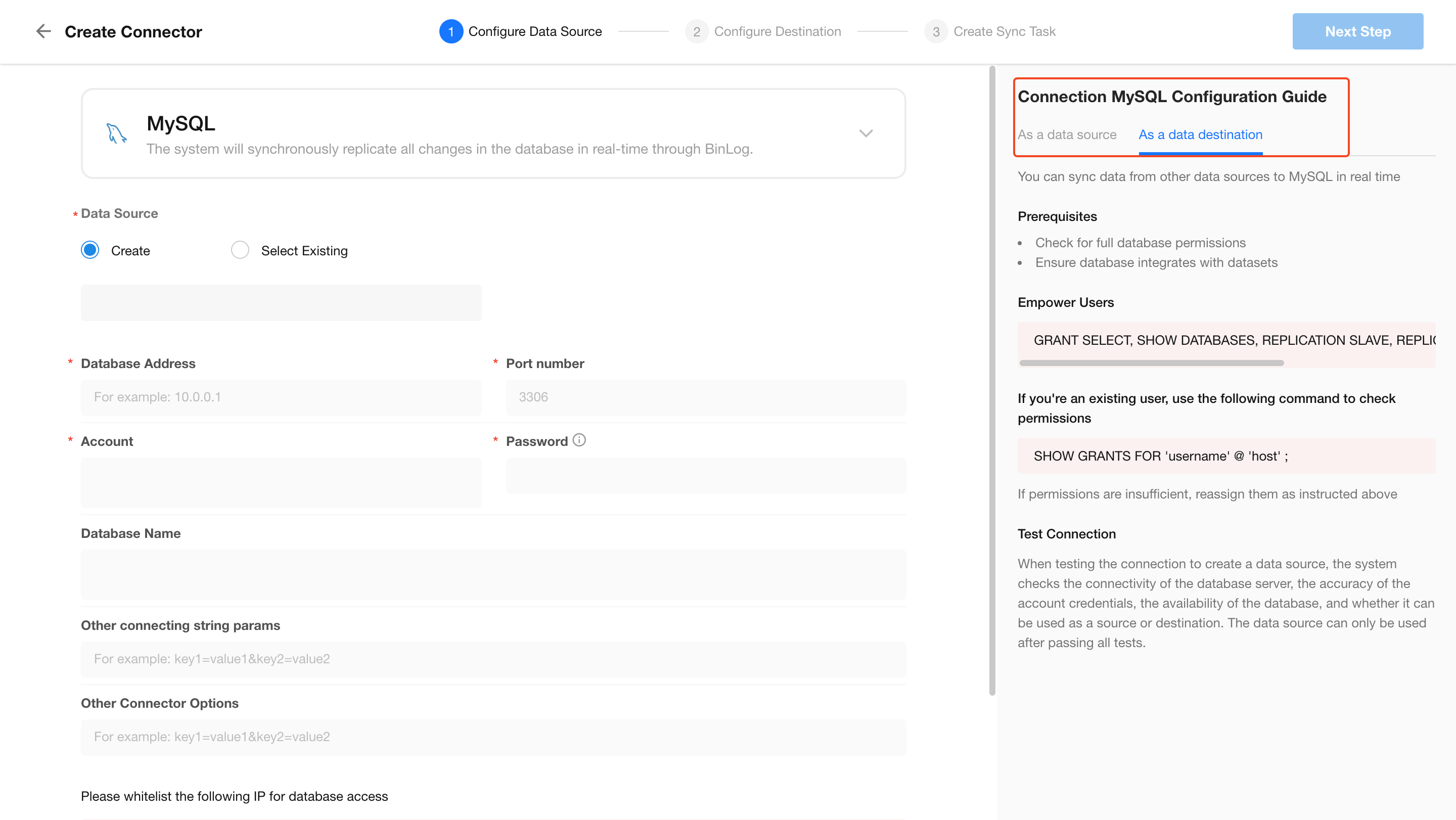 Once prerequisites are met, enter the required database connection information on the left. Click Test Connection, and upon success, click Next in the top-right corner.