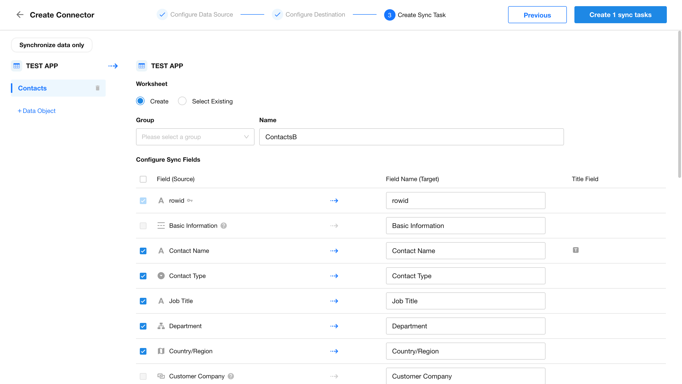 Next, define the field mapping between source and destination, then click “Create X Sync Tasks.”