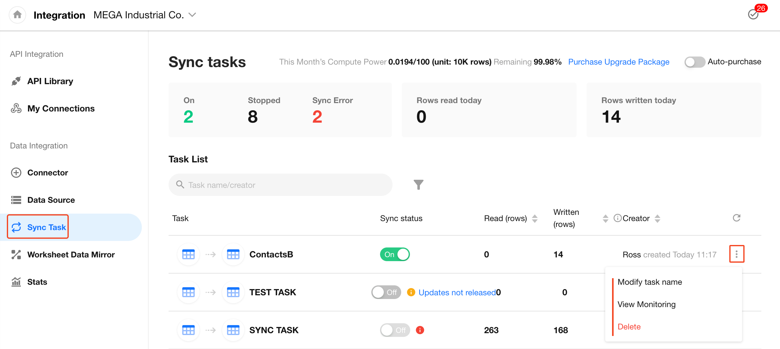Once a sync task is created, you can modify its settings, monitor its status, and track the volume of synchronized data. The monitoring dashboard provides insights such as cumulative run time, total records read and written, and recent data activity through trend charts.