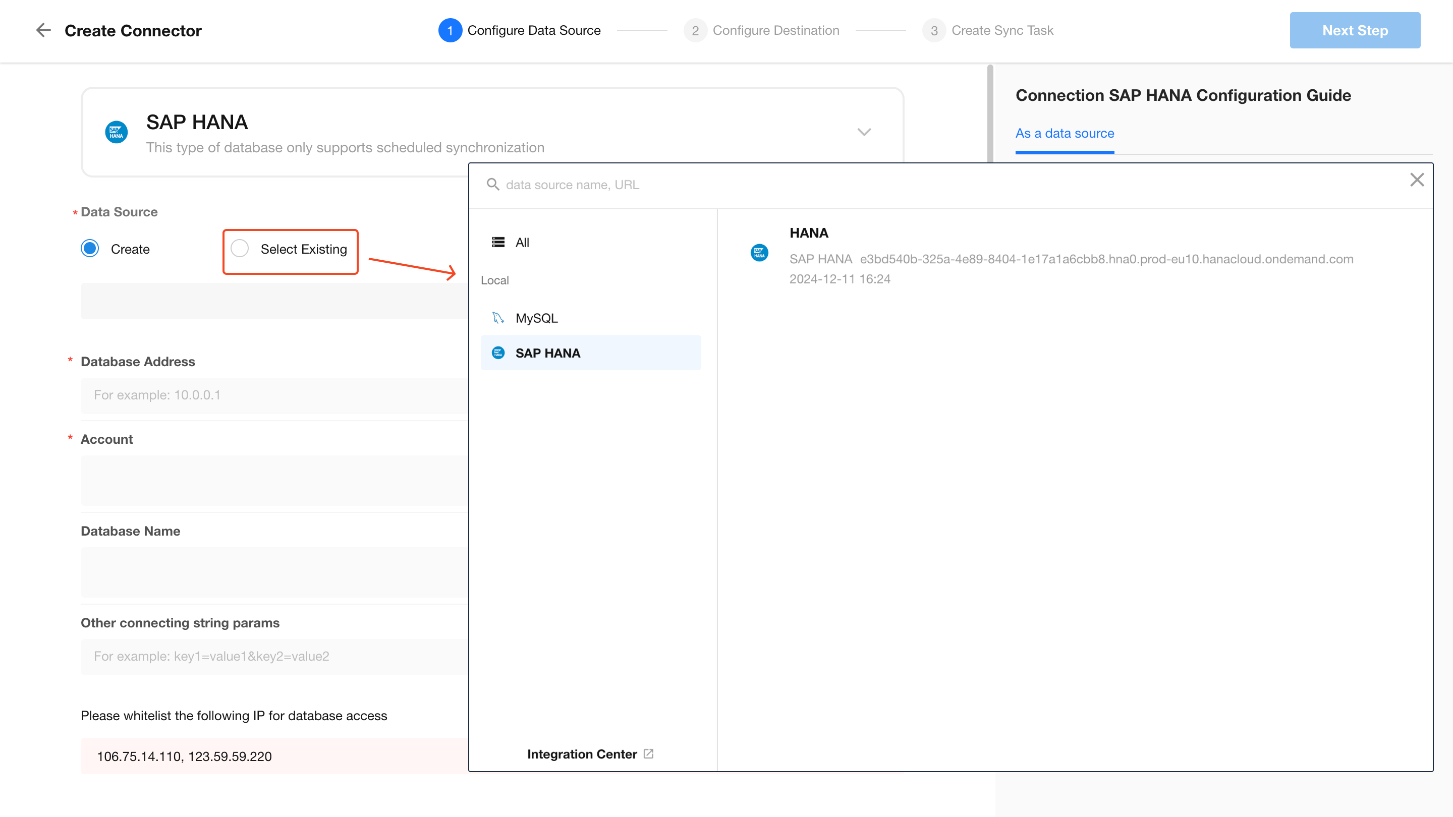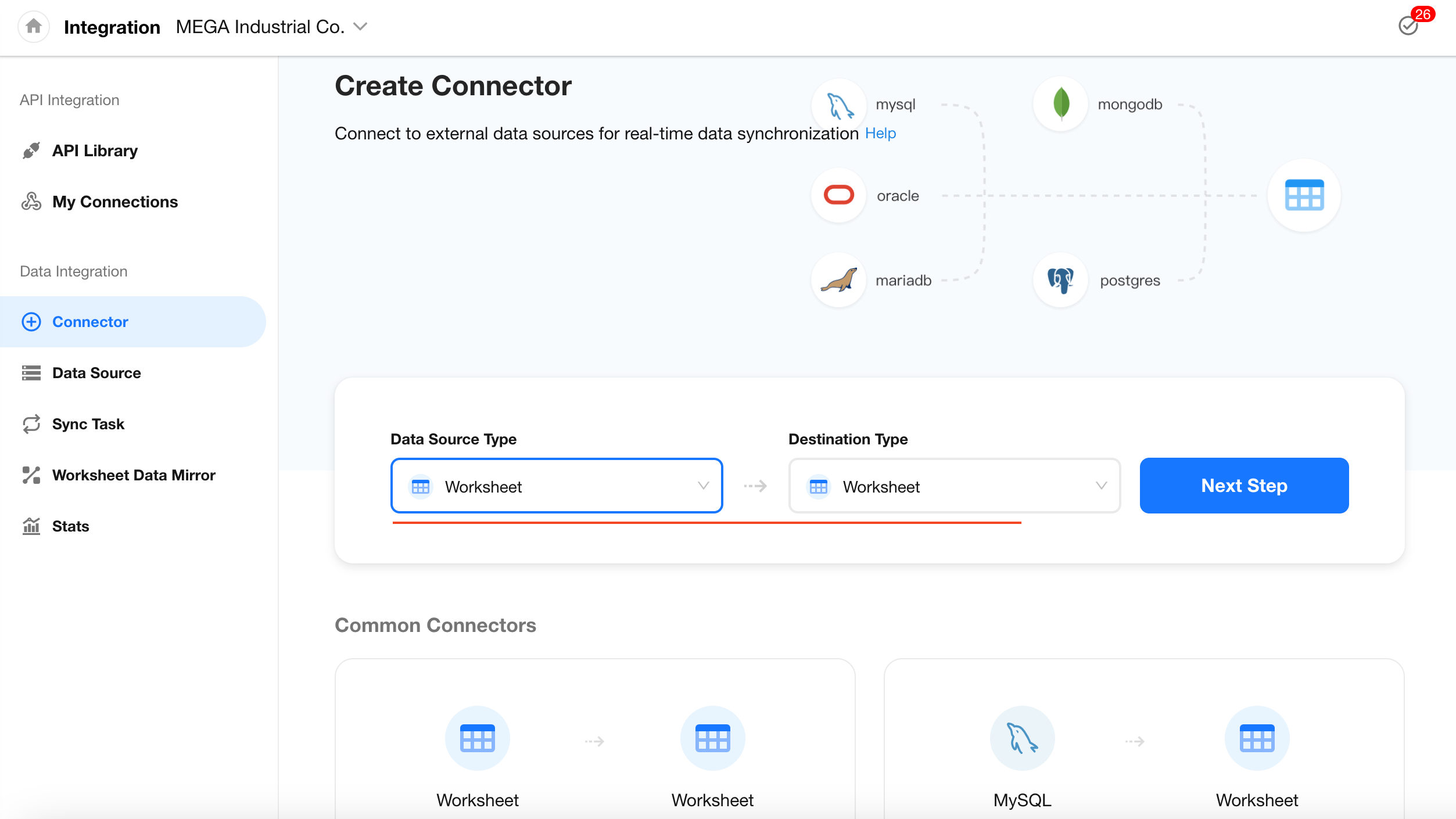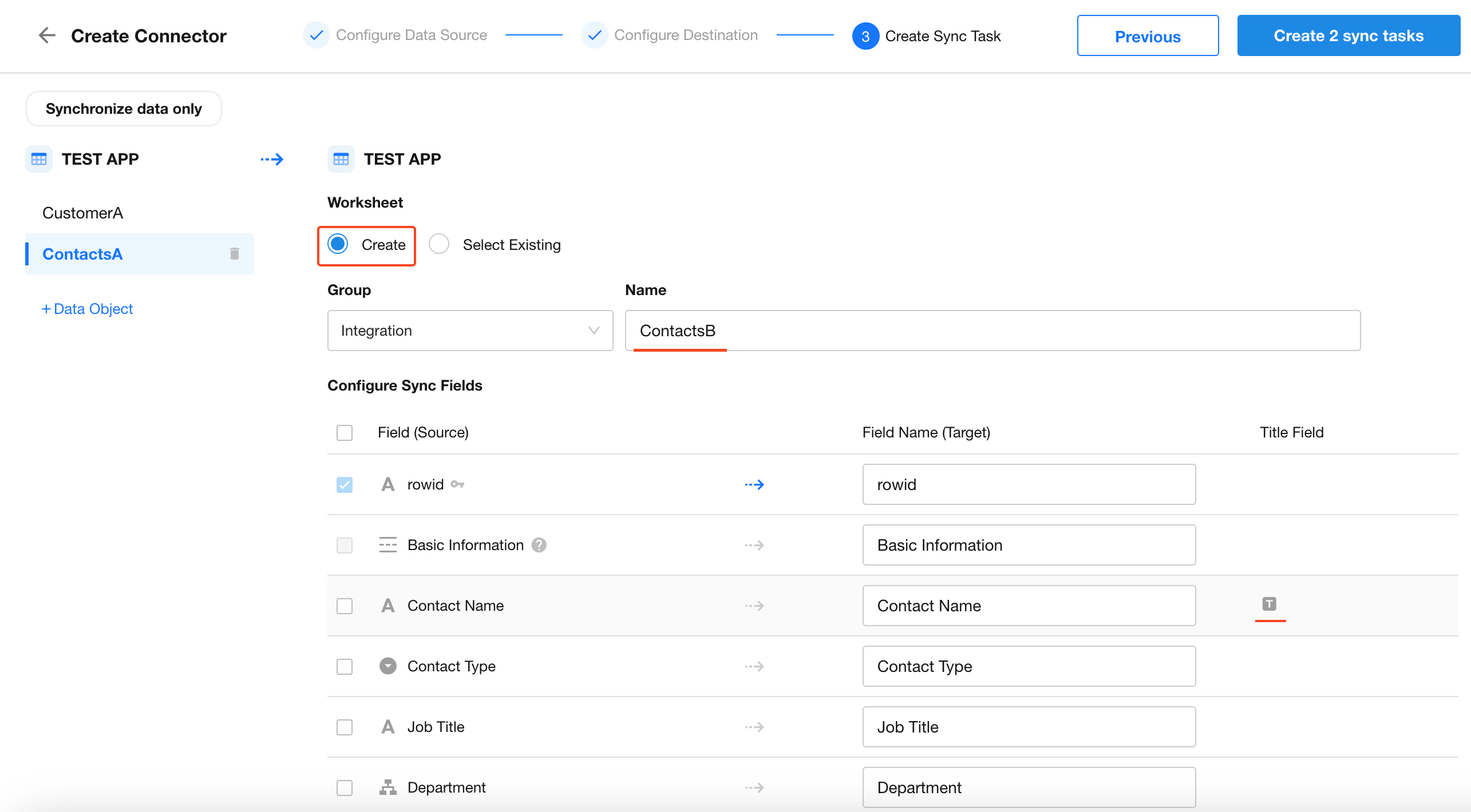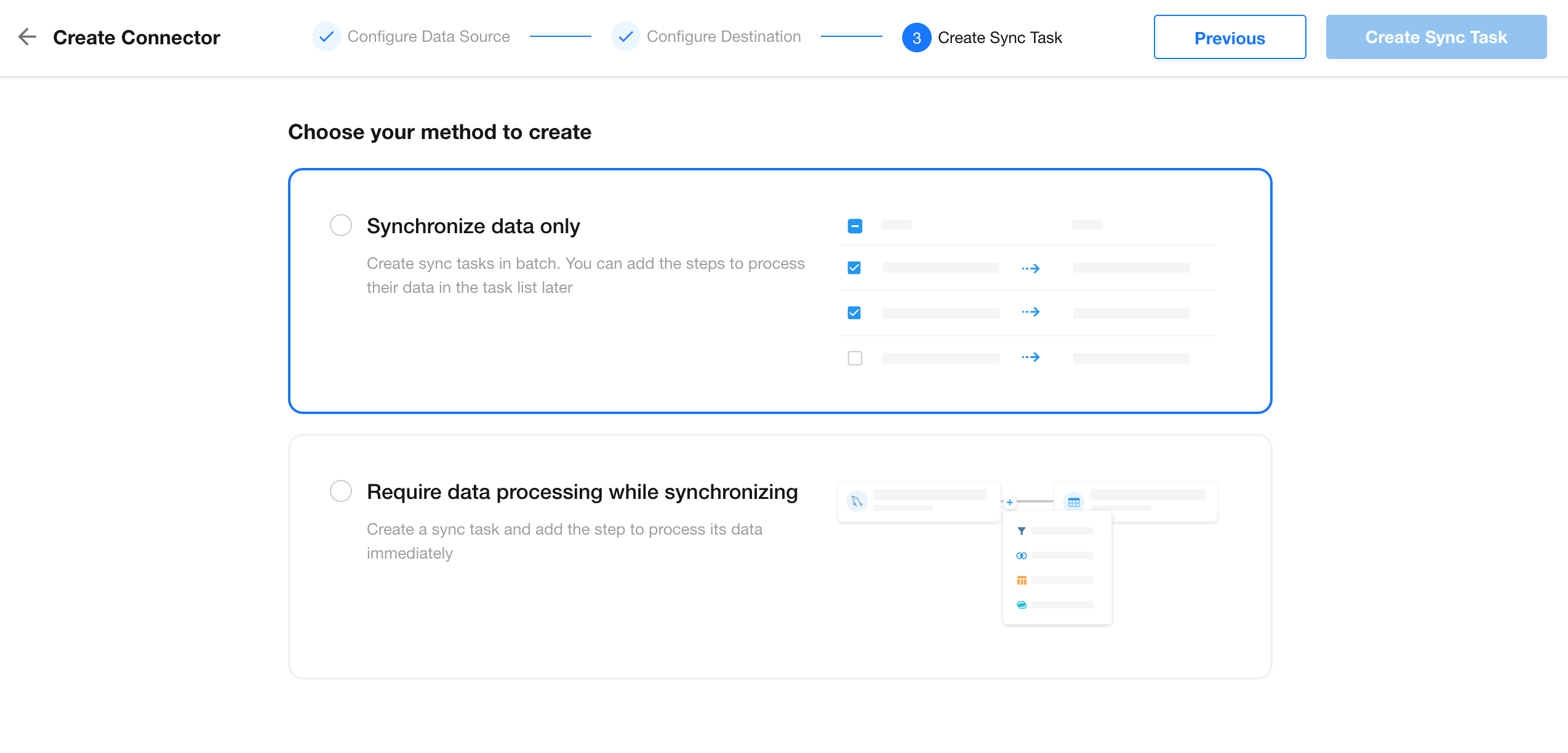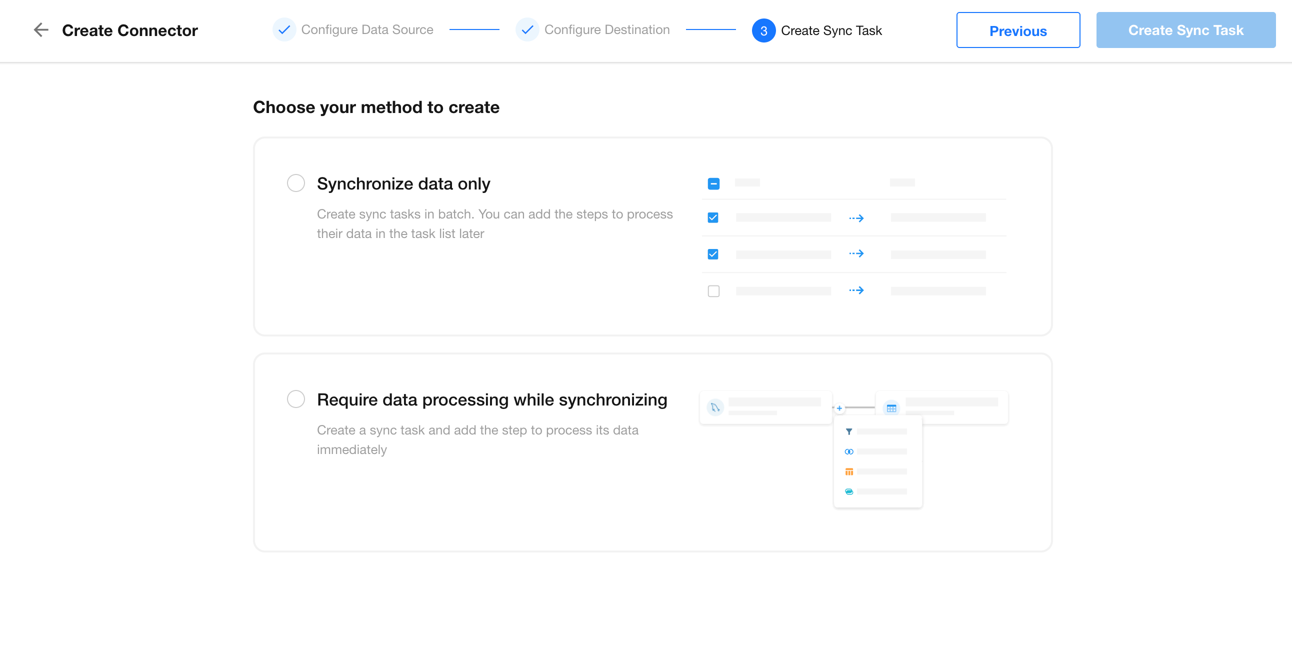 A connector establishes the connection between source and destination databases and defines the field mapping. During this step, you can create multiple sync tasks from multiple tables within the same data source.
