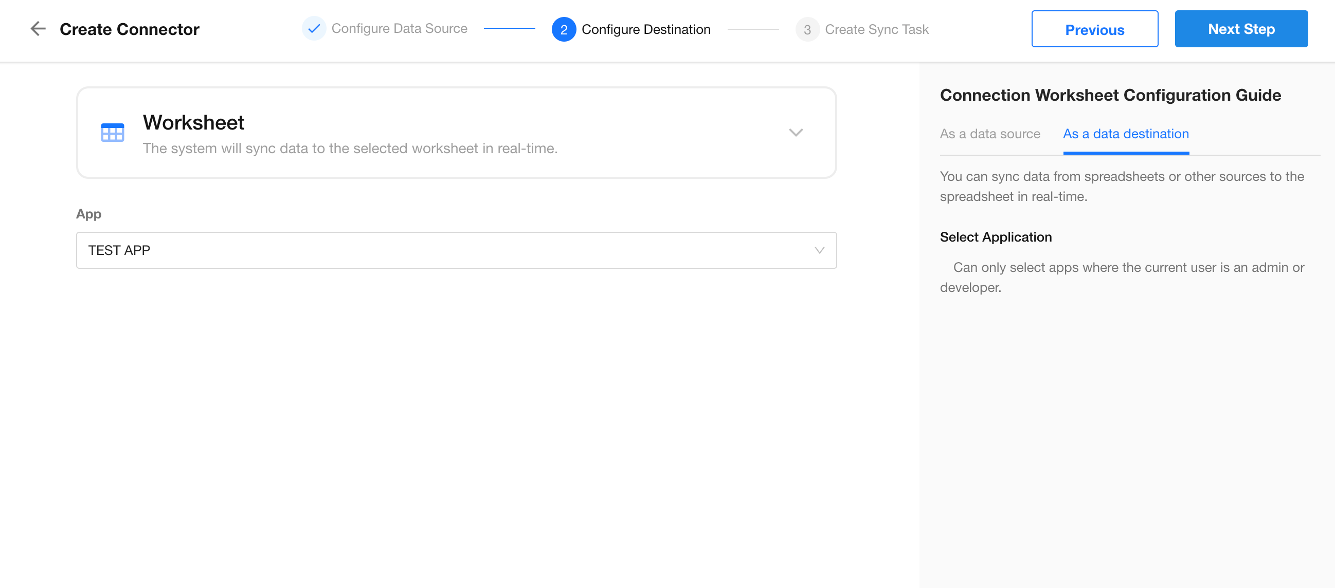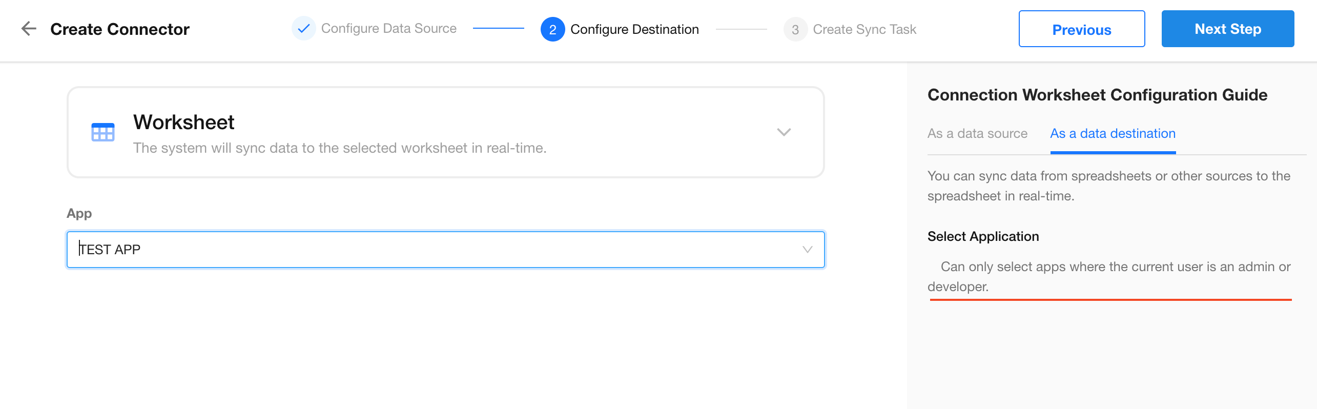 Choose the target app where the worksheet will be created or updated. Then, click Next.