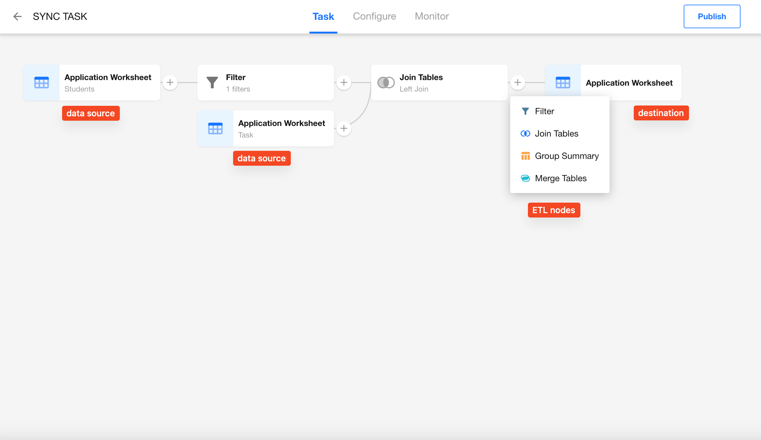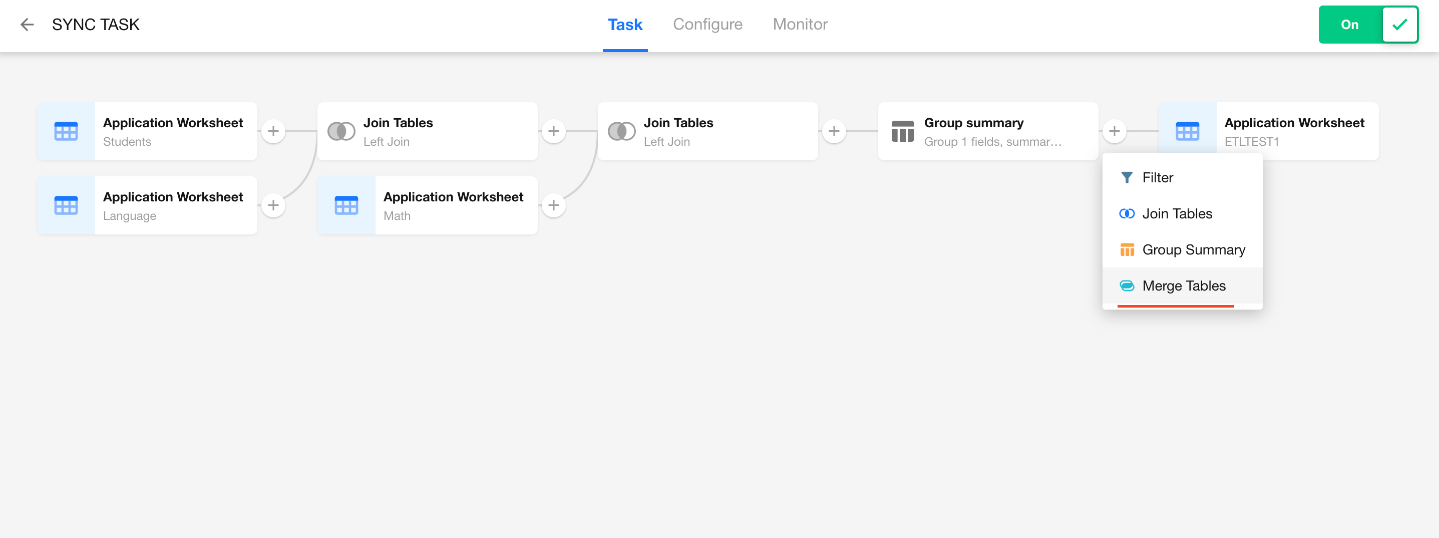 In any data sync task, hover between two nodes and click “+” to add a Merge Tables node.