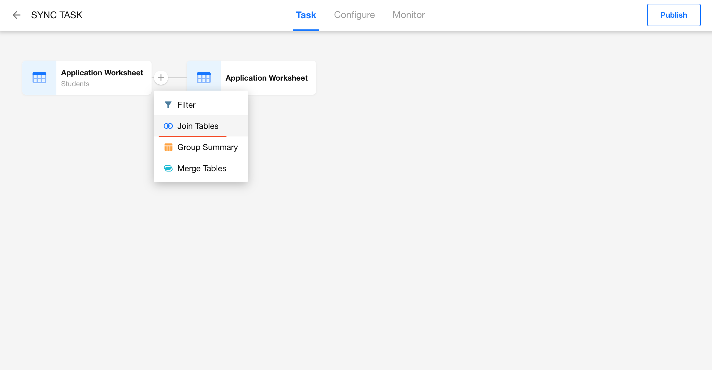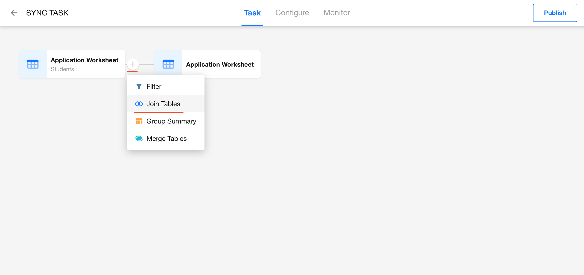 In any data sync task, hover between two nodes and click the “+” button to insert a Join Tables node.