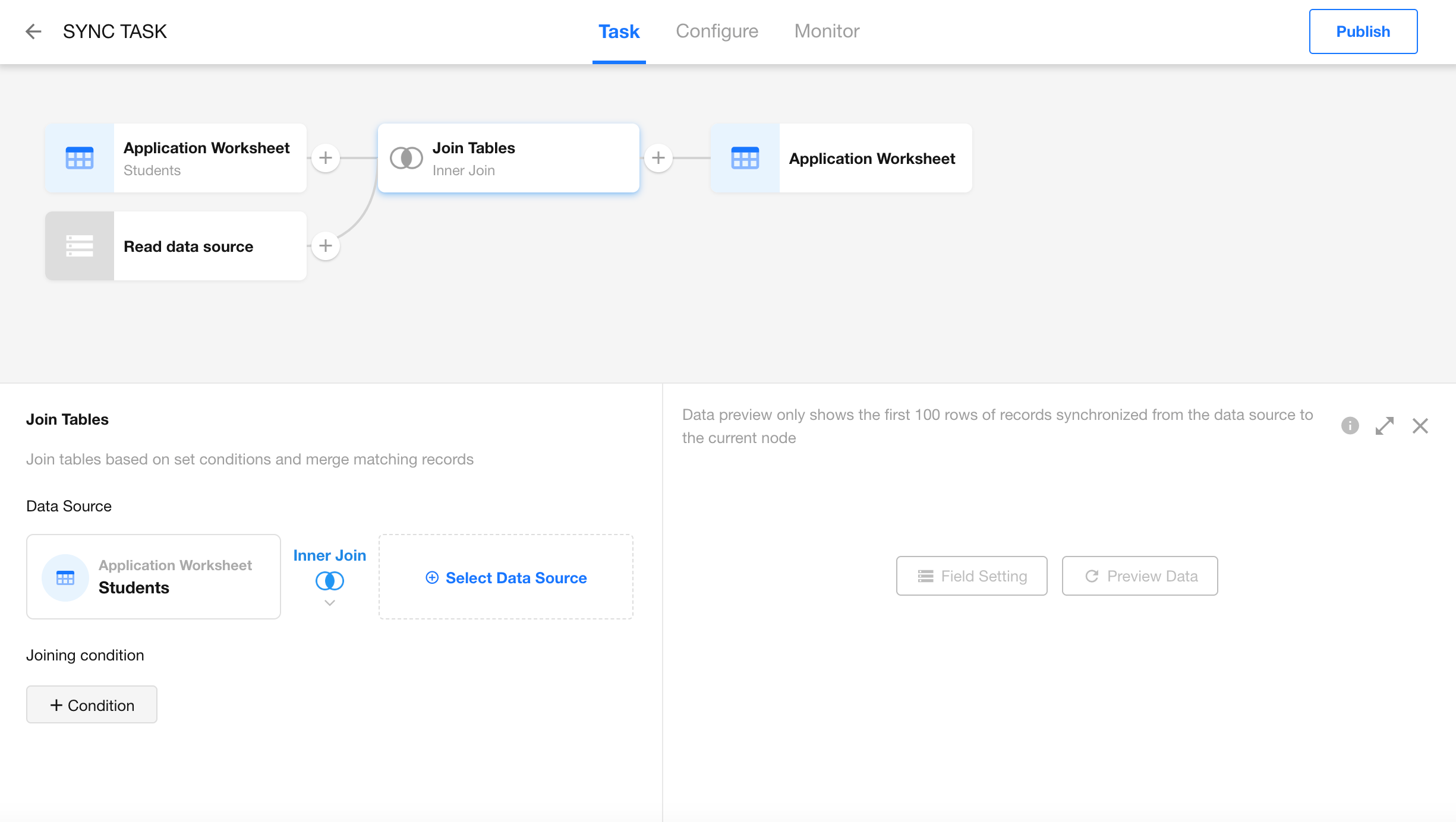 First, select the data source. Then return to the Join Tables node to set up the join fields and conditions.