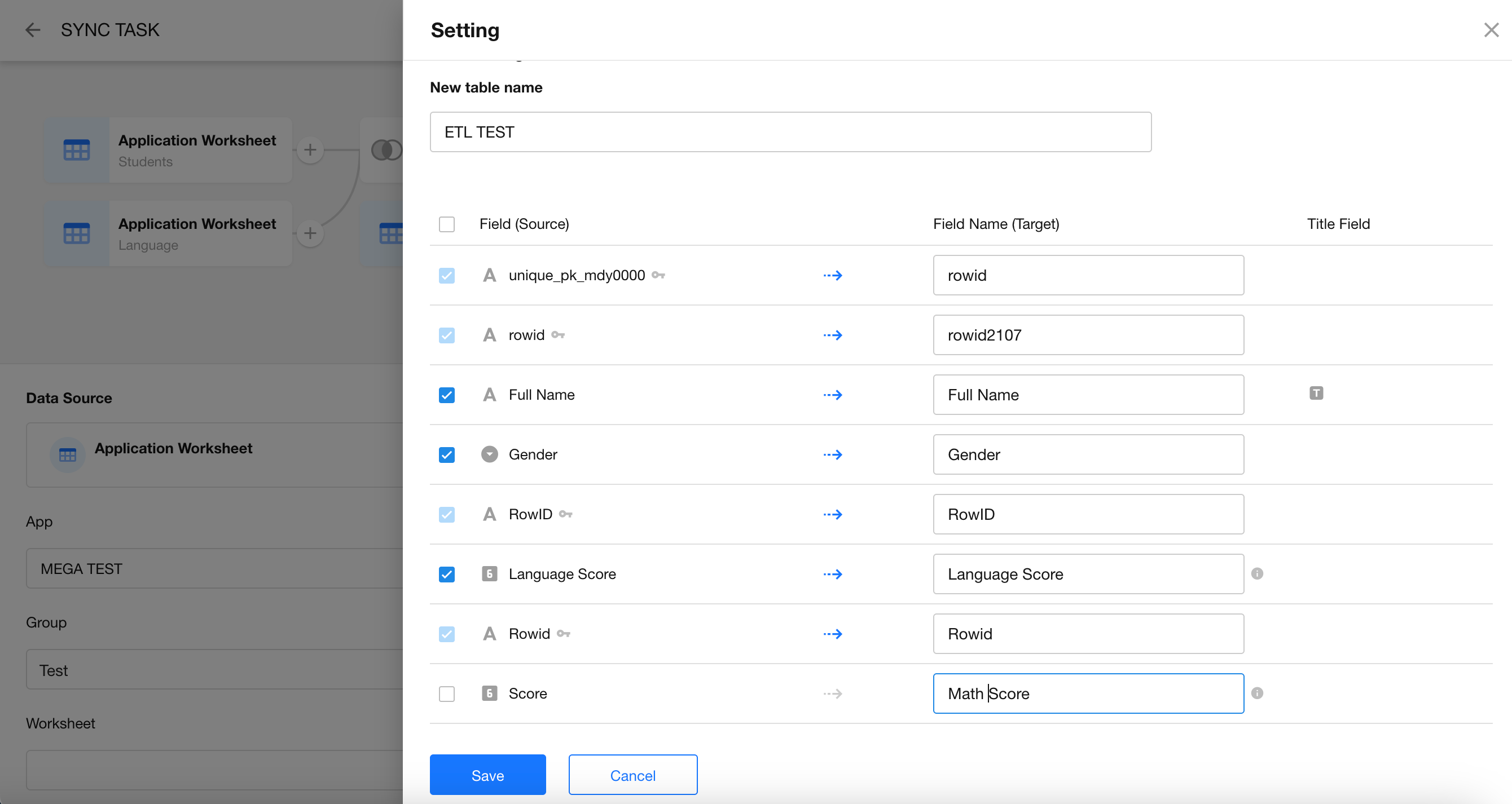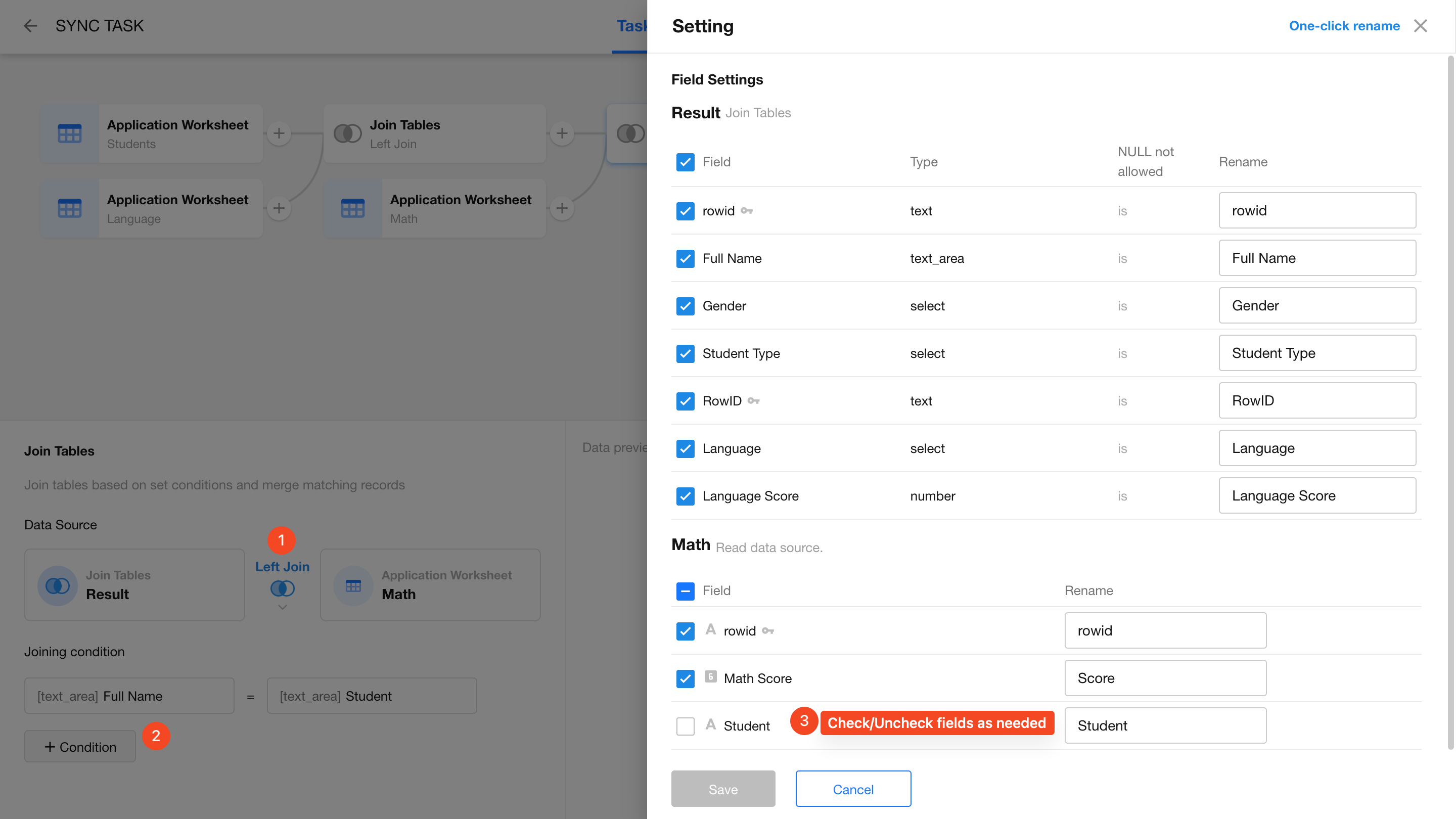 - Edit Fields: Deselect the Name field from the Math Scores worksheet if it's not needed.