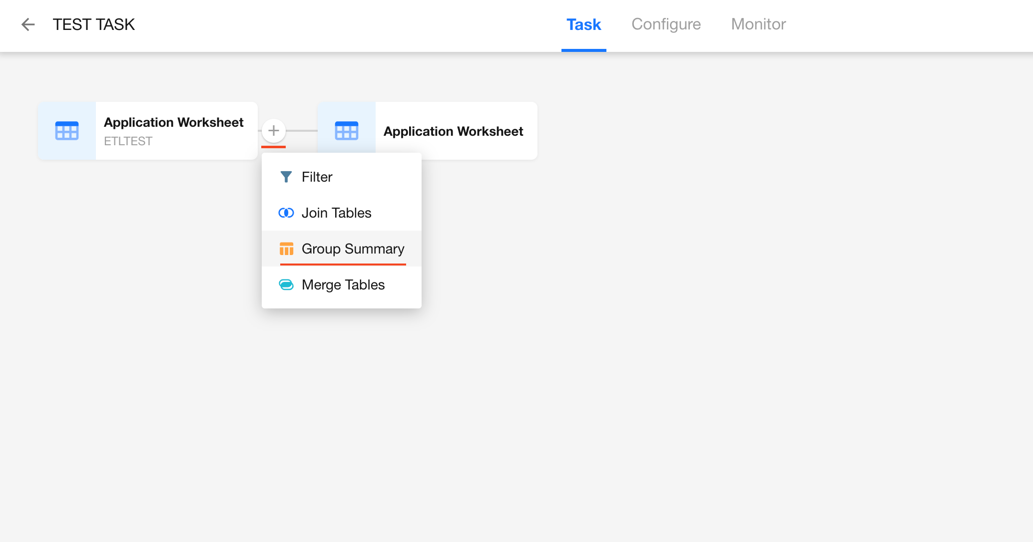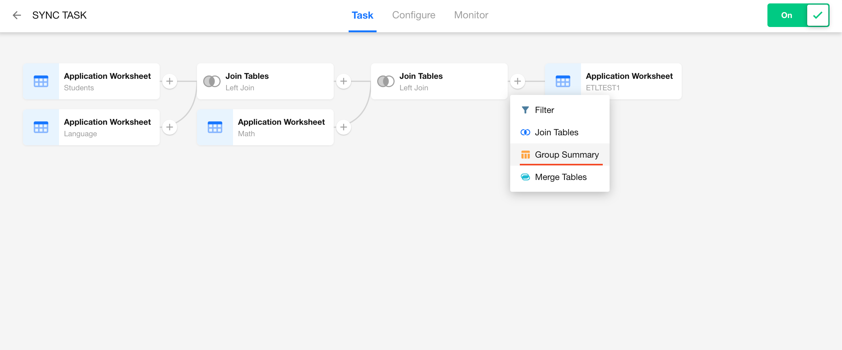 From any data sync task, hover between two nodes and click “+” to add a Group Summary node.