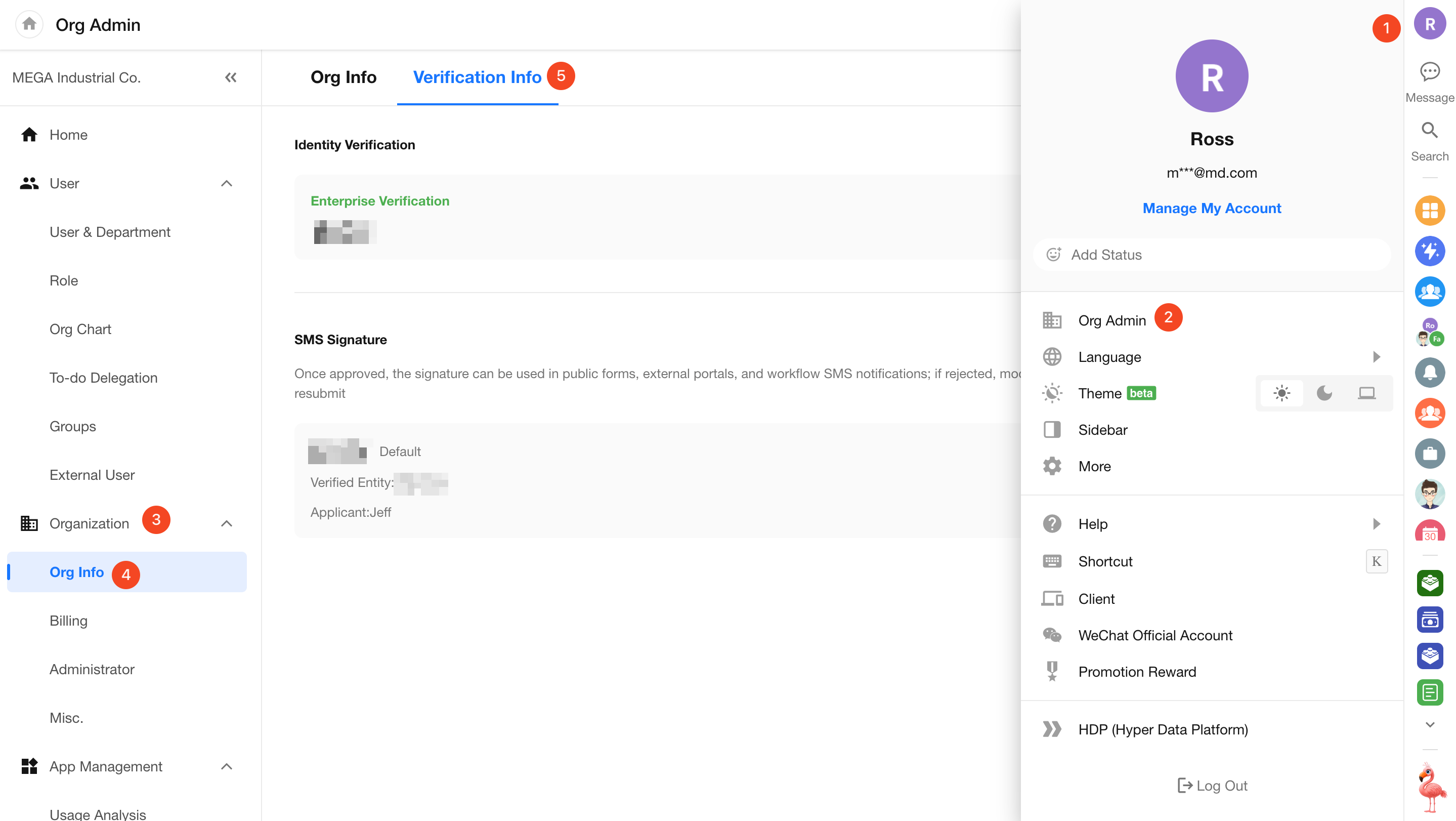 As an organization admin, click your profile avatar and go to [Org Admin] > [Organization] > [Org Info] > [Verification Info].