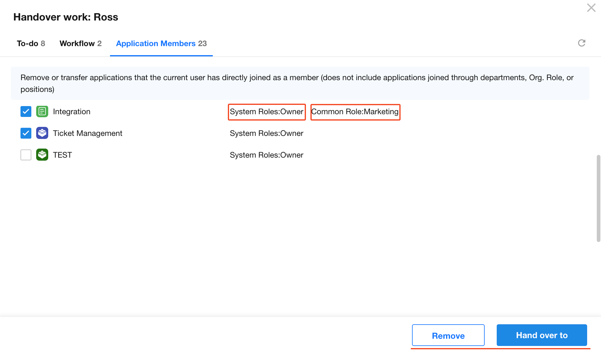 This lists all apps the employee is part of and their assigned roles. You can batch remove the employee from these apps or transfer their roles to someone else.