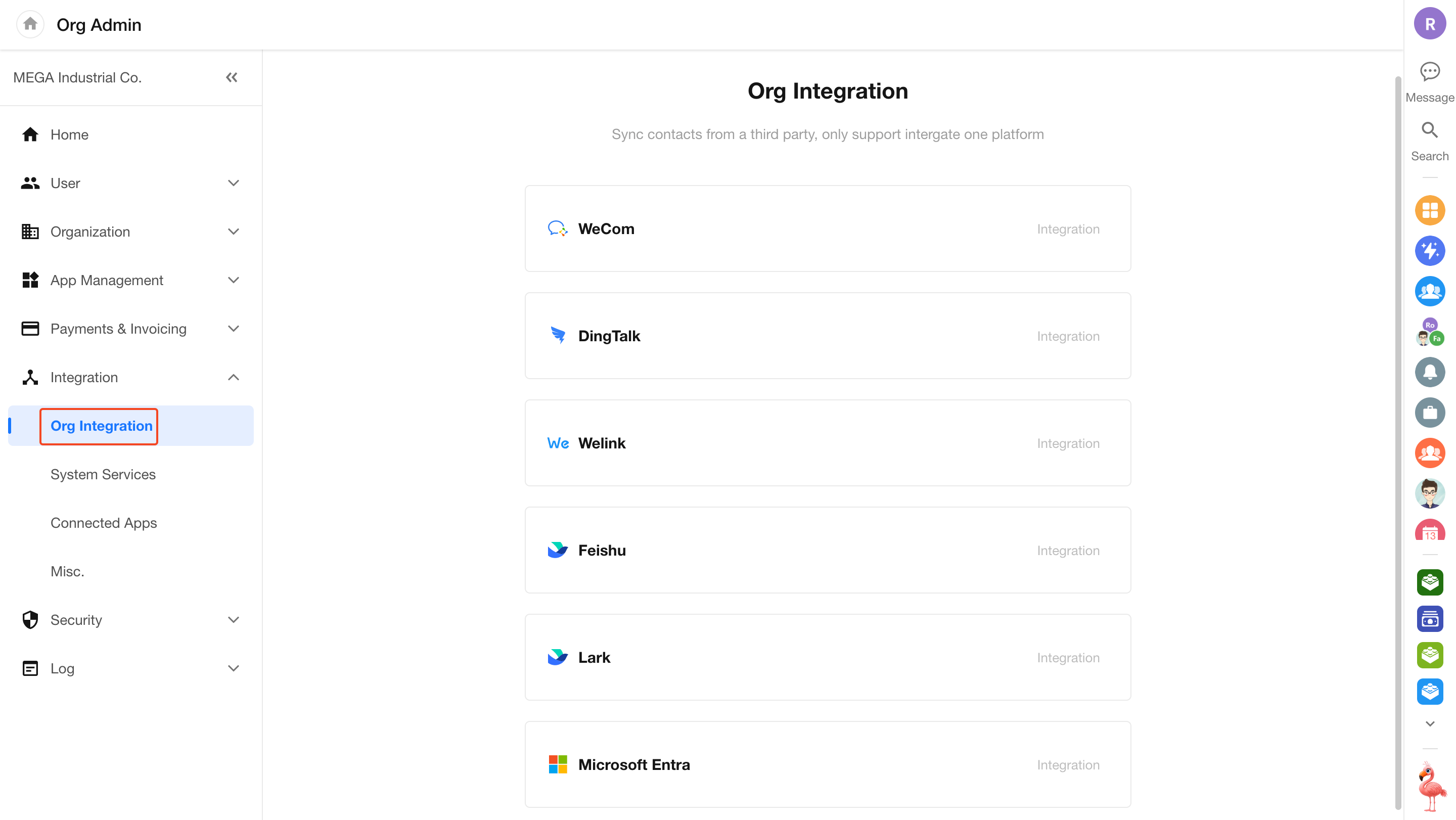 The Integration module in the Organization Admin Console includes enterprise identity synchronization, third-party service integrations, multi-factor authentication, and organization-level API access. By integrating with major platforms, you can quickly enable organizational synchronization, enhance business capabilities, and implement unified and secure access management.