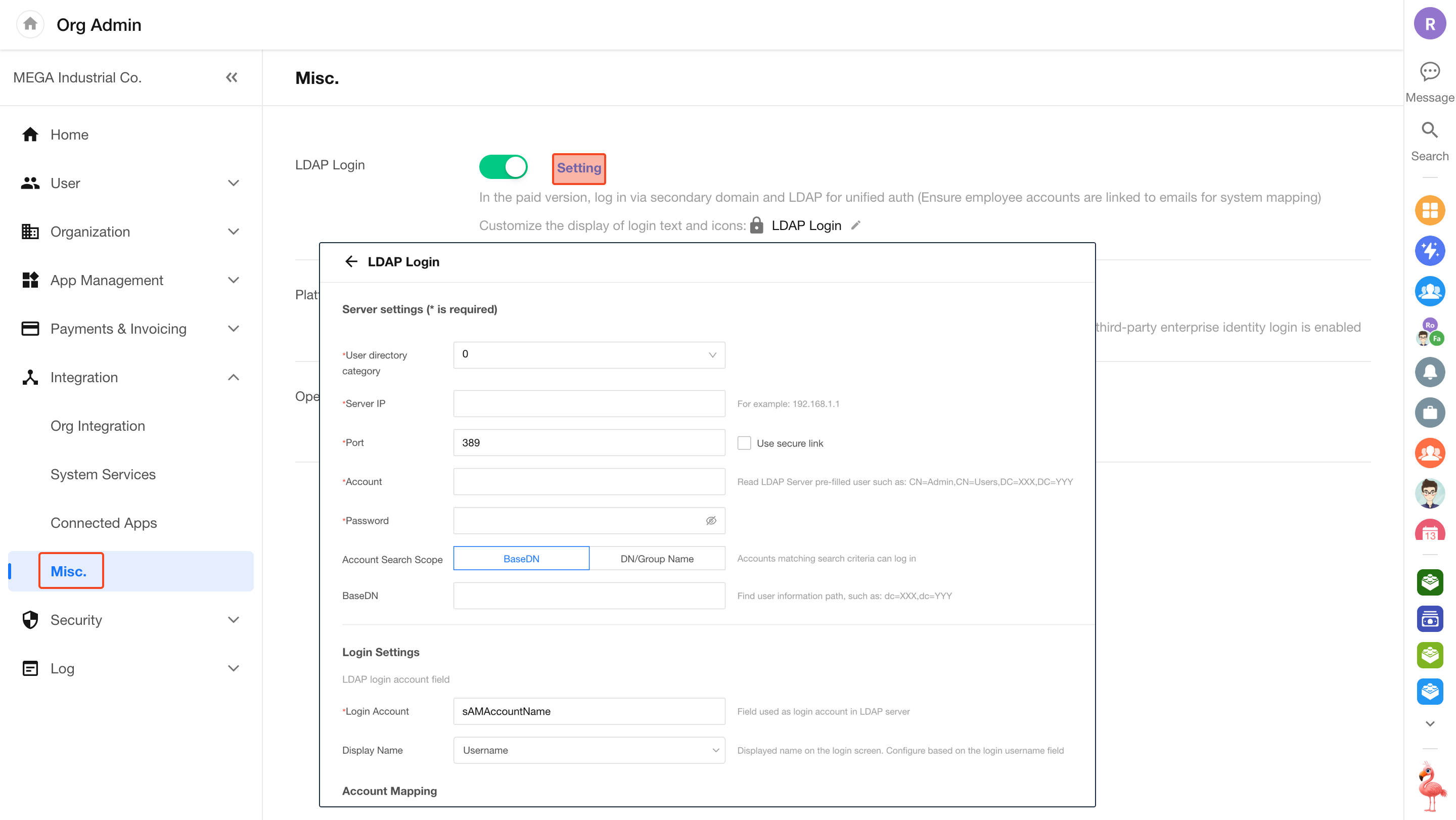 Go to [Org Admin] > [Integration] > [Misc.], enable LDAP login, and click Setting to configure server and synchronization details. -
