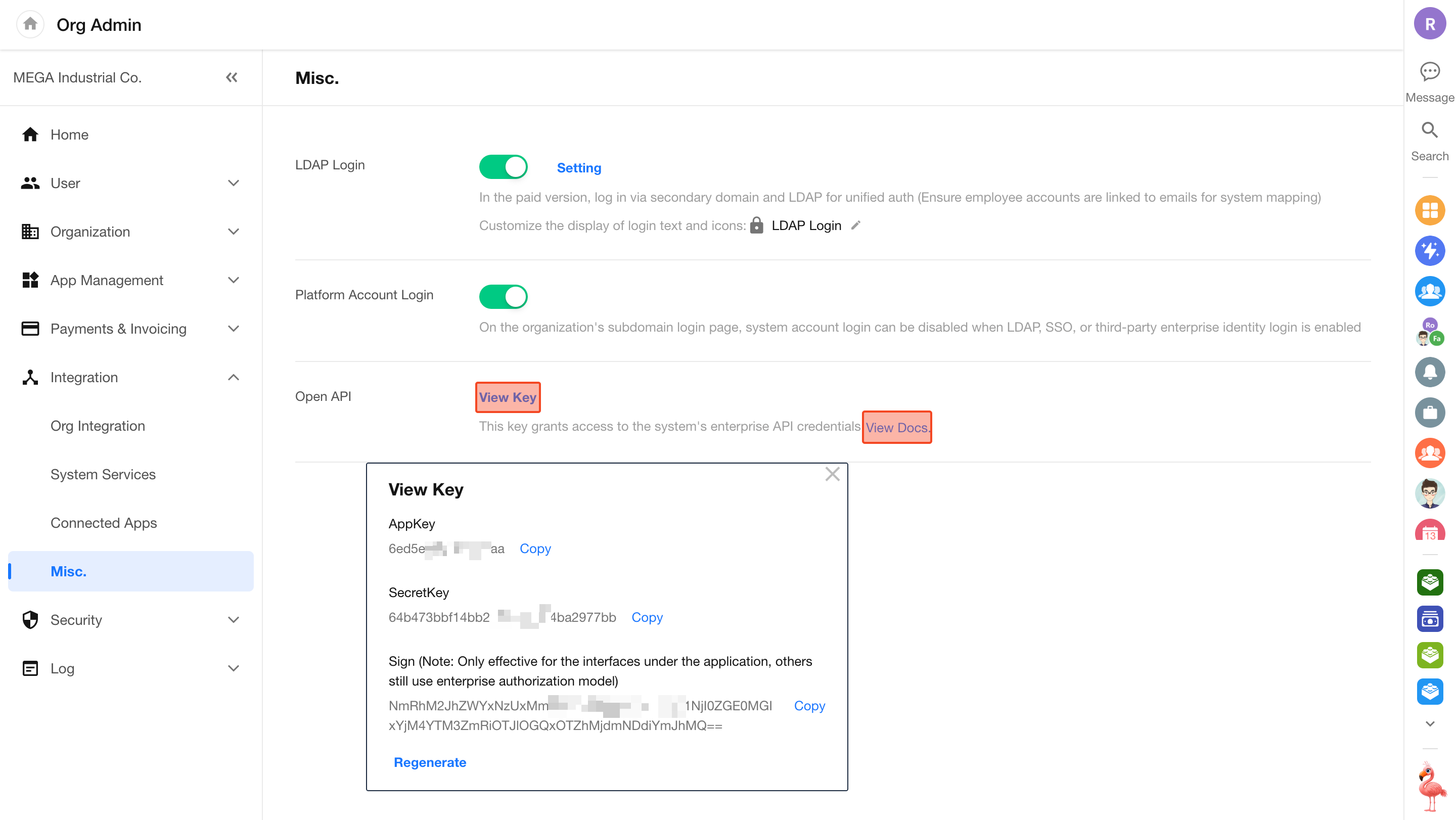 Go to [Org Admin] > [Integration] > [Misc.], click View Key to obtain the key pair, and click View Docs to access detailed API documentation.