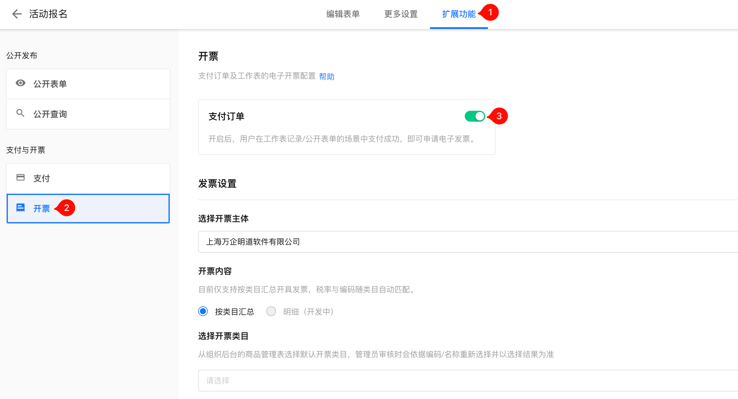 进入工作表的表单编辑页面,依次点选 【扩展功能】 > 【开票】 ,开启【订单支付】后,配置发票设置。