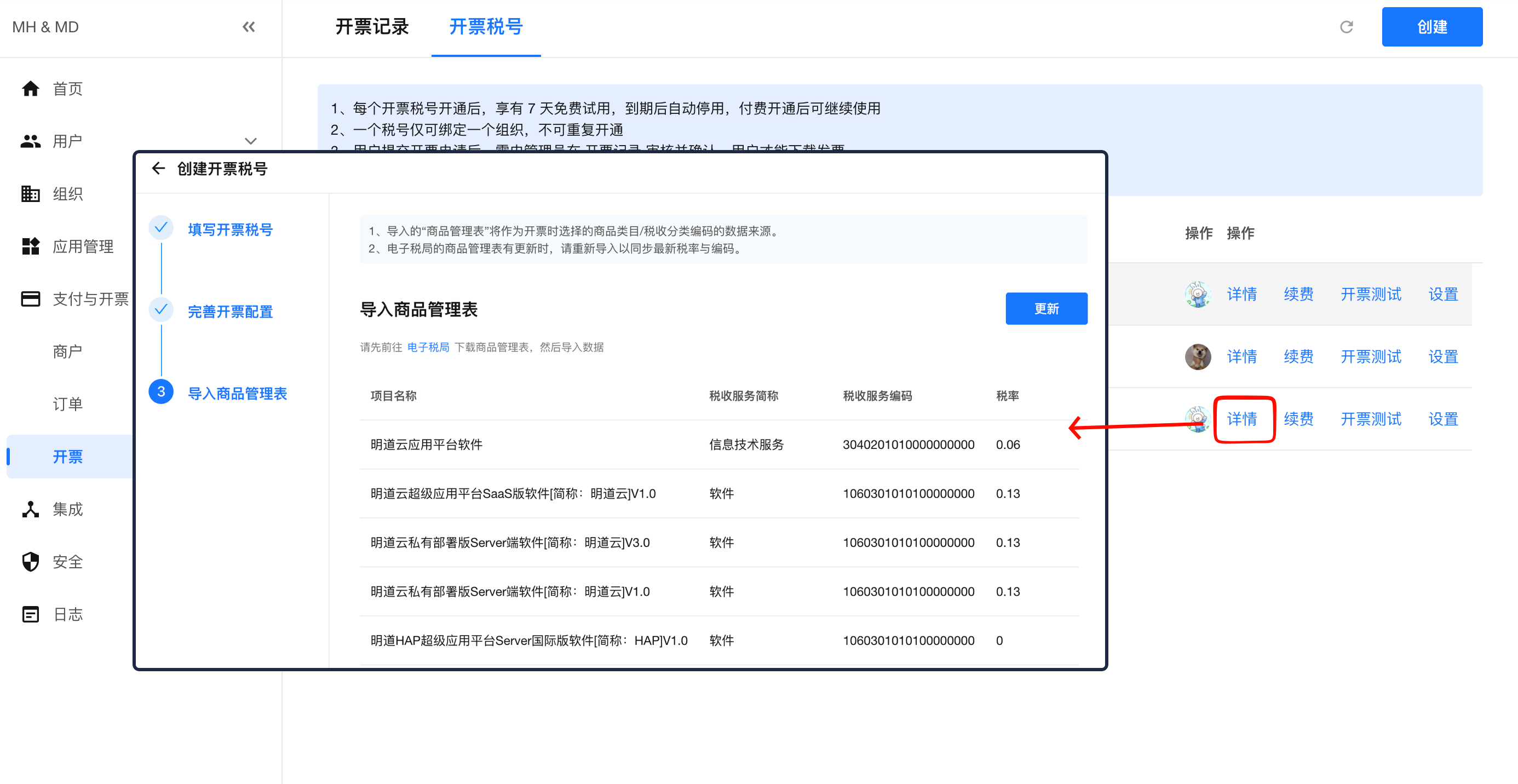 在税号的操作列中点击“详情”按钮,可“导入商品管理表”并更新税号。
