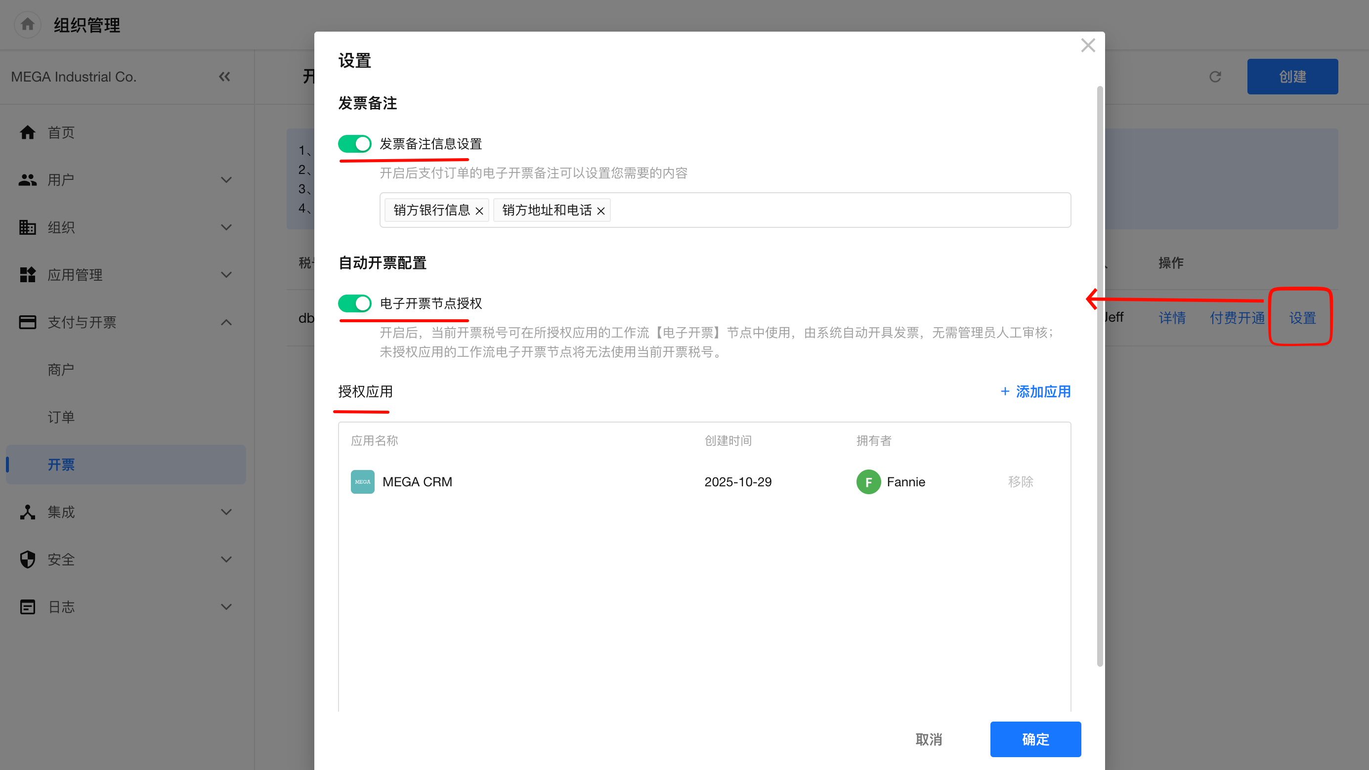 点击“设置”按钮,可设置发票备注与自动开票权限,能够进一步提升财务流程的自动化程度与合规性。