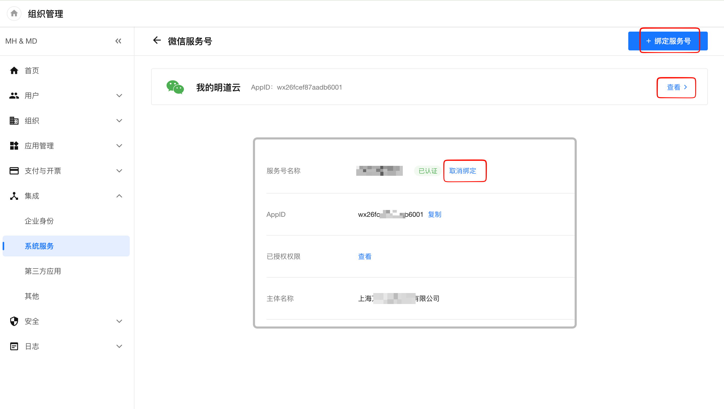 取消绑定: 点击对应服务号卡片的 【查看】,进入详情页后点击 【取消绑定】。