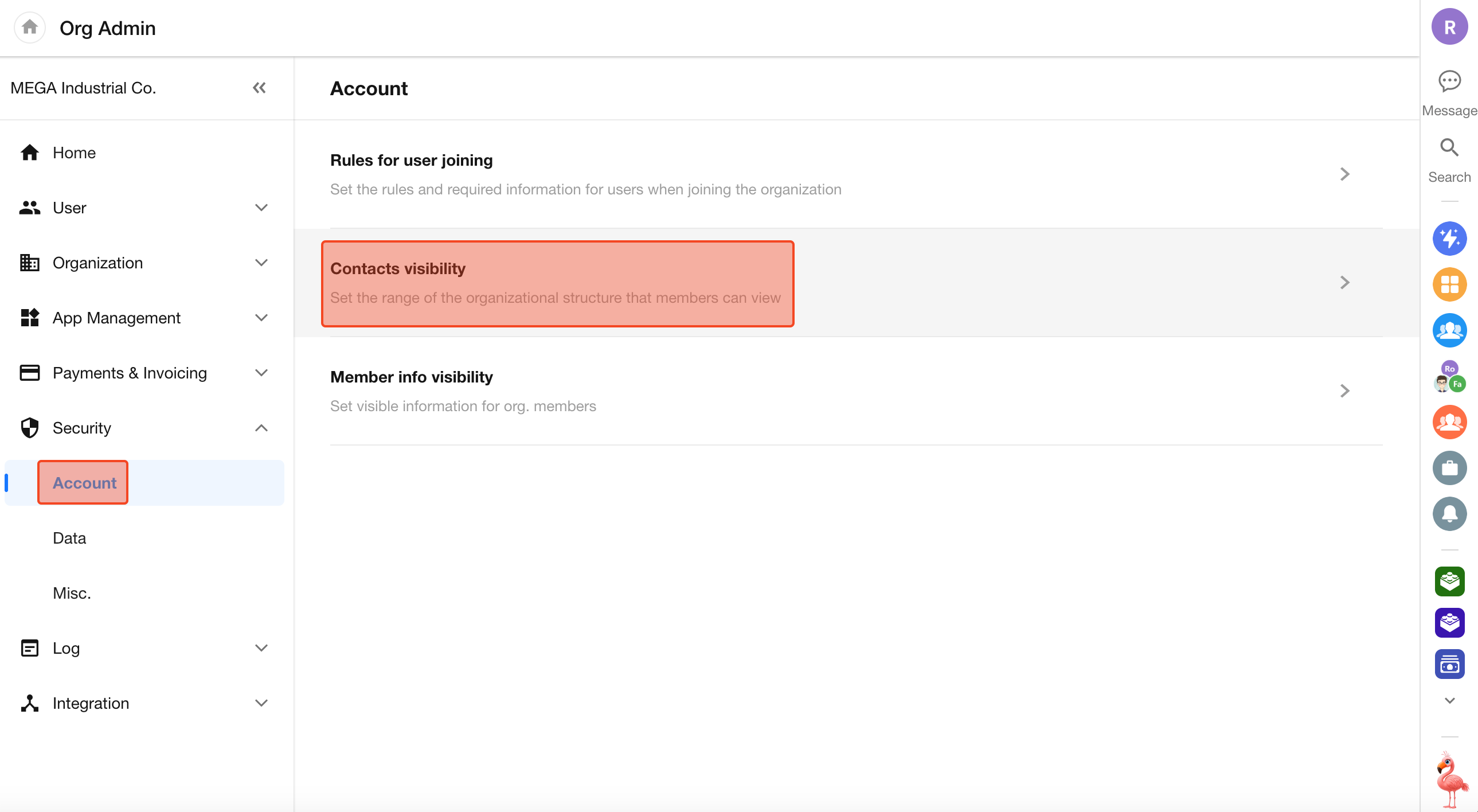 Navigate to [Org Admin] > [Security] > [Account] to define access rules when users join the organization, including approval policies and required identity information.
