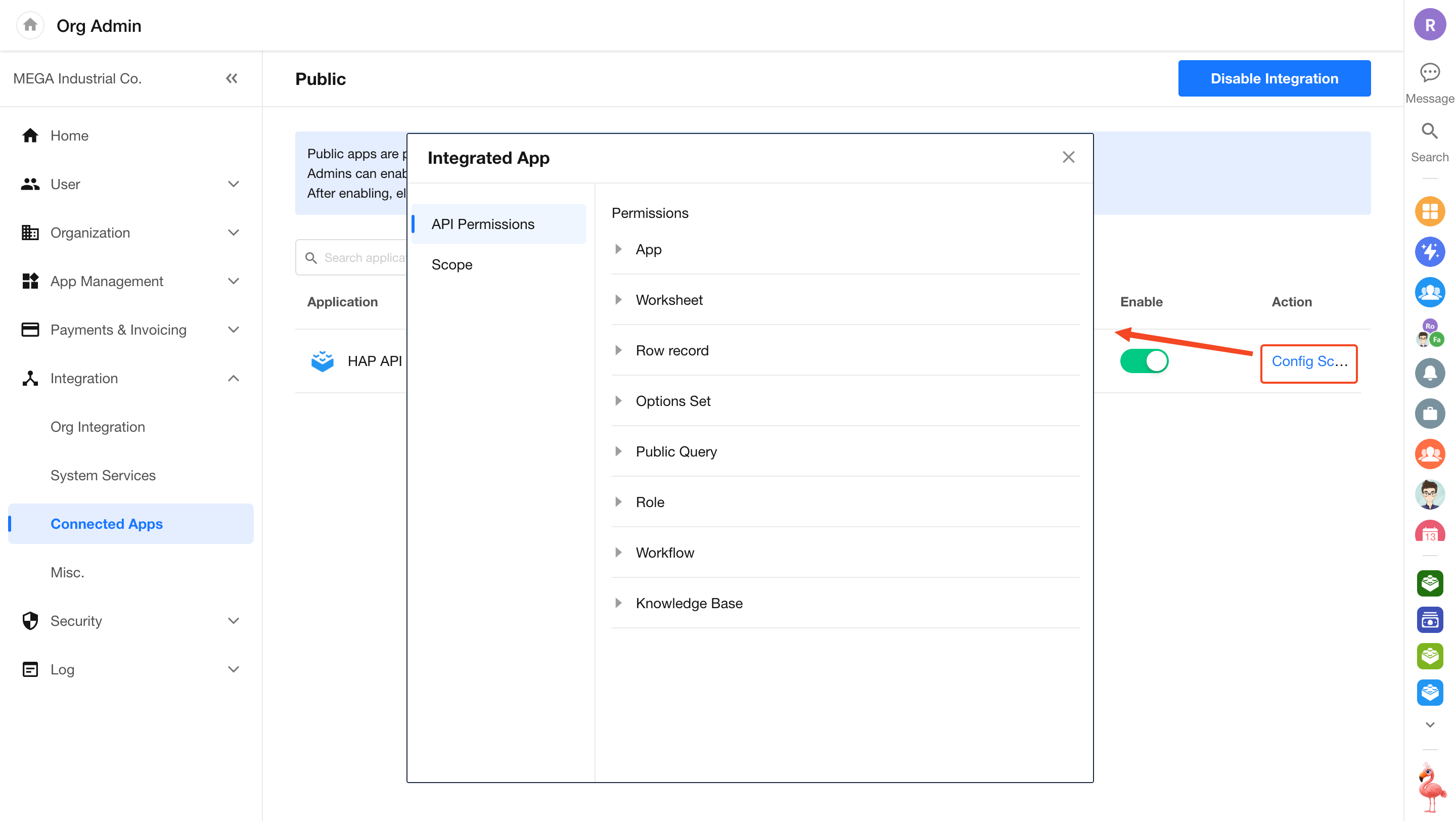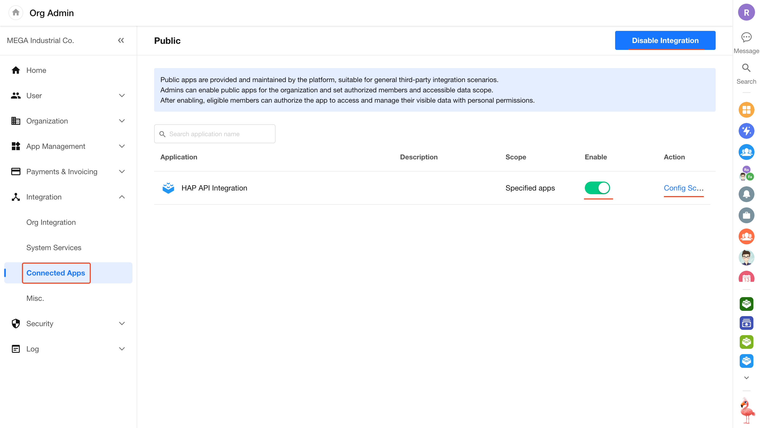 Go to [Org Admin] > [Integration] > [Connected Apps] to access the management page.