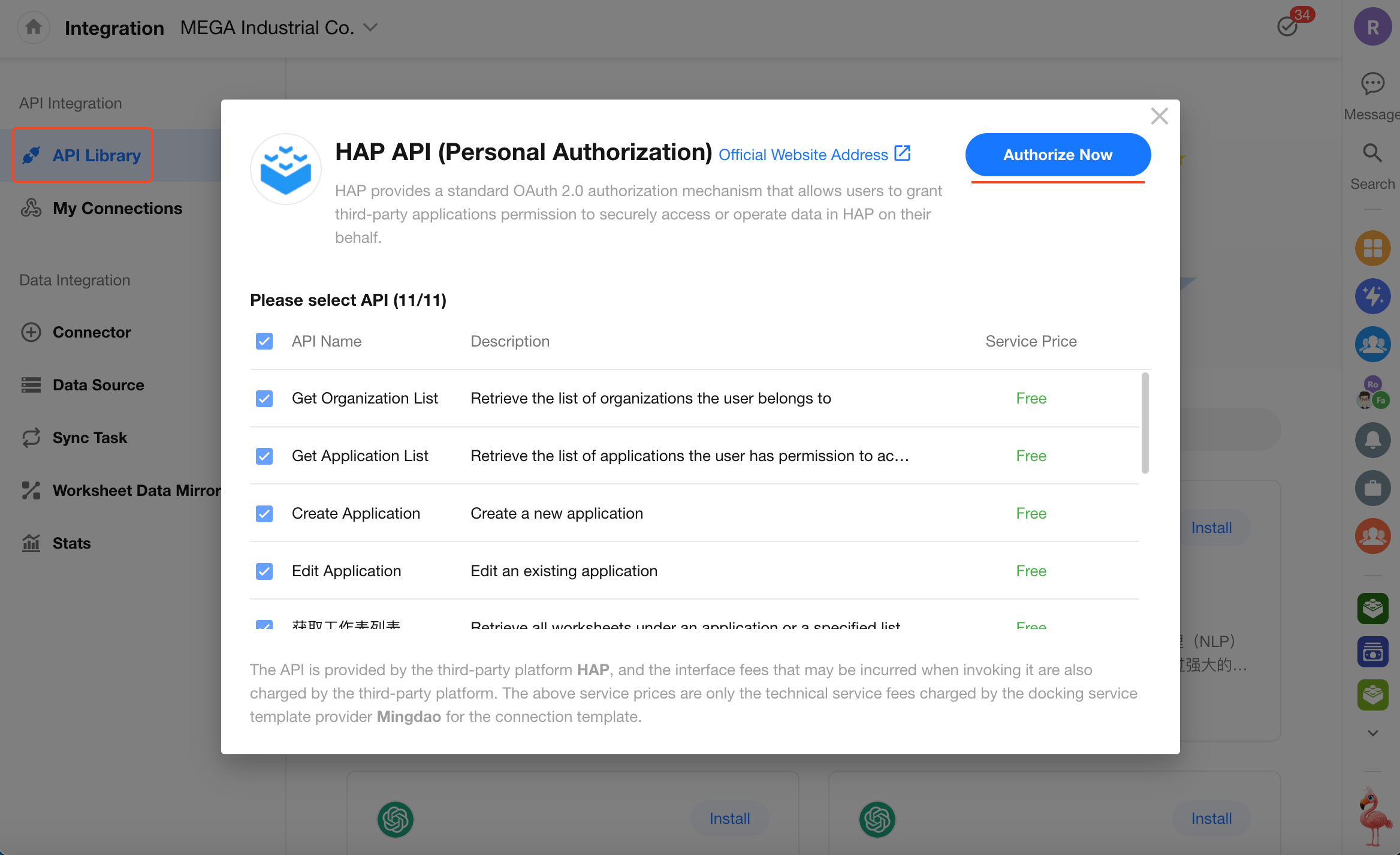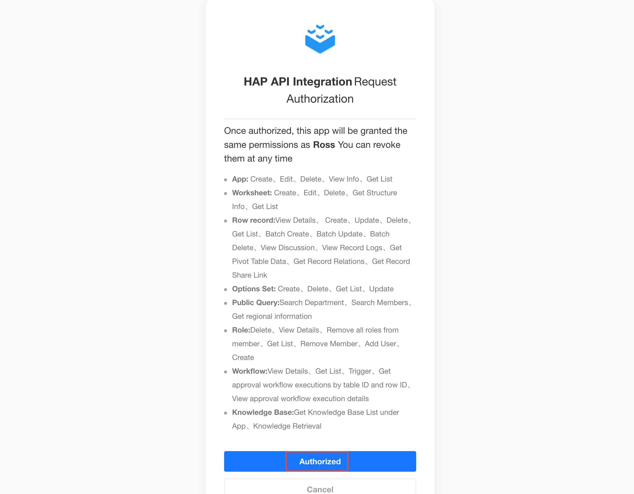 Third-party applications use HAP’s standard OAuth 2.0 authorization mechanism. After user consent, these applications can securely access or operate user data in HAP on behalf of the user. By using short-lived credentials (Access Tokens), this approach is more secure and controllable than long-term key-based methods.