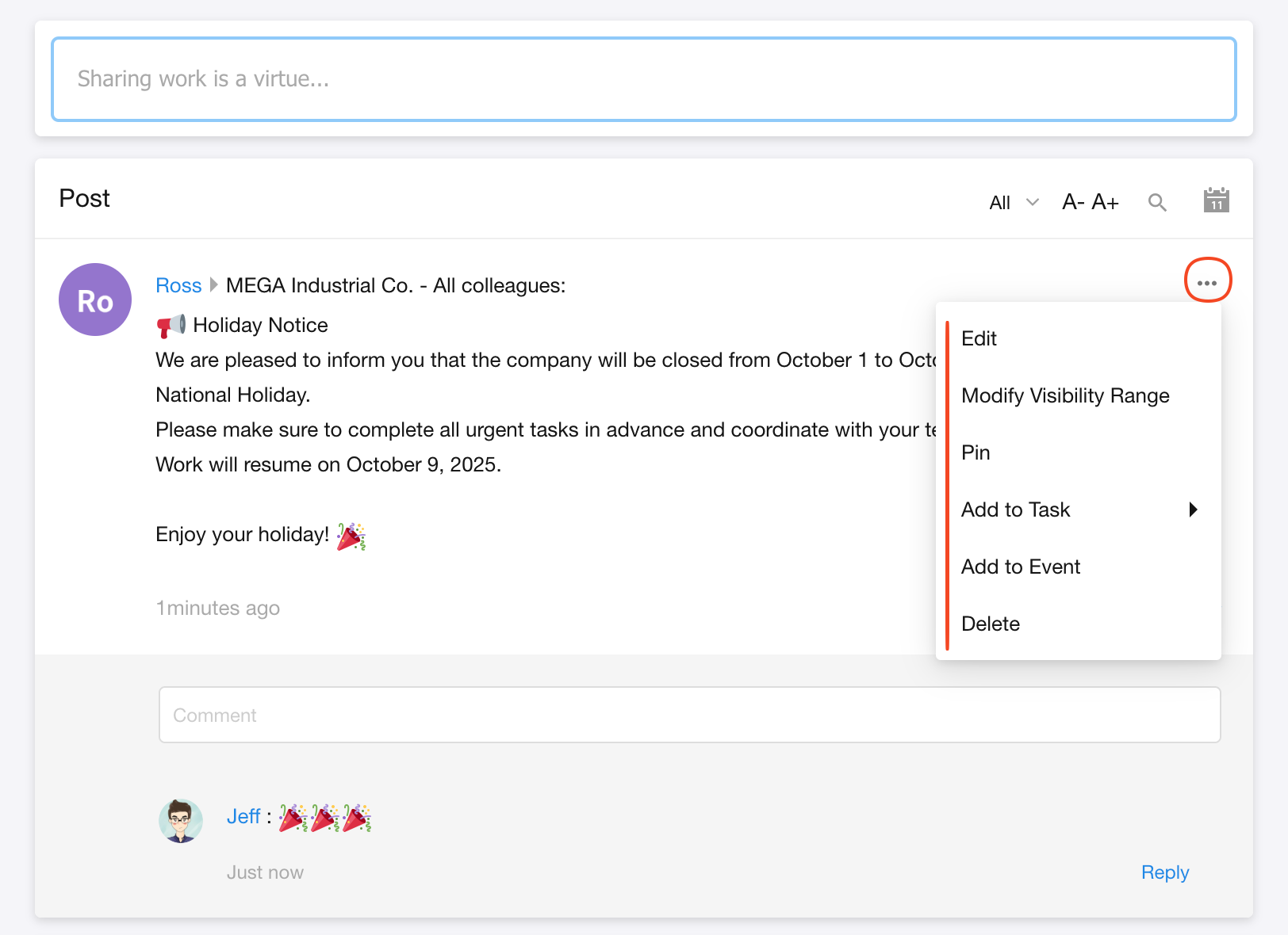 - Delete a Post: Both the post creator and super admins who can view the post are allowed to delete it.