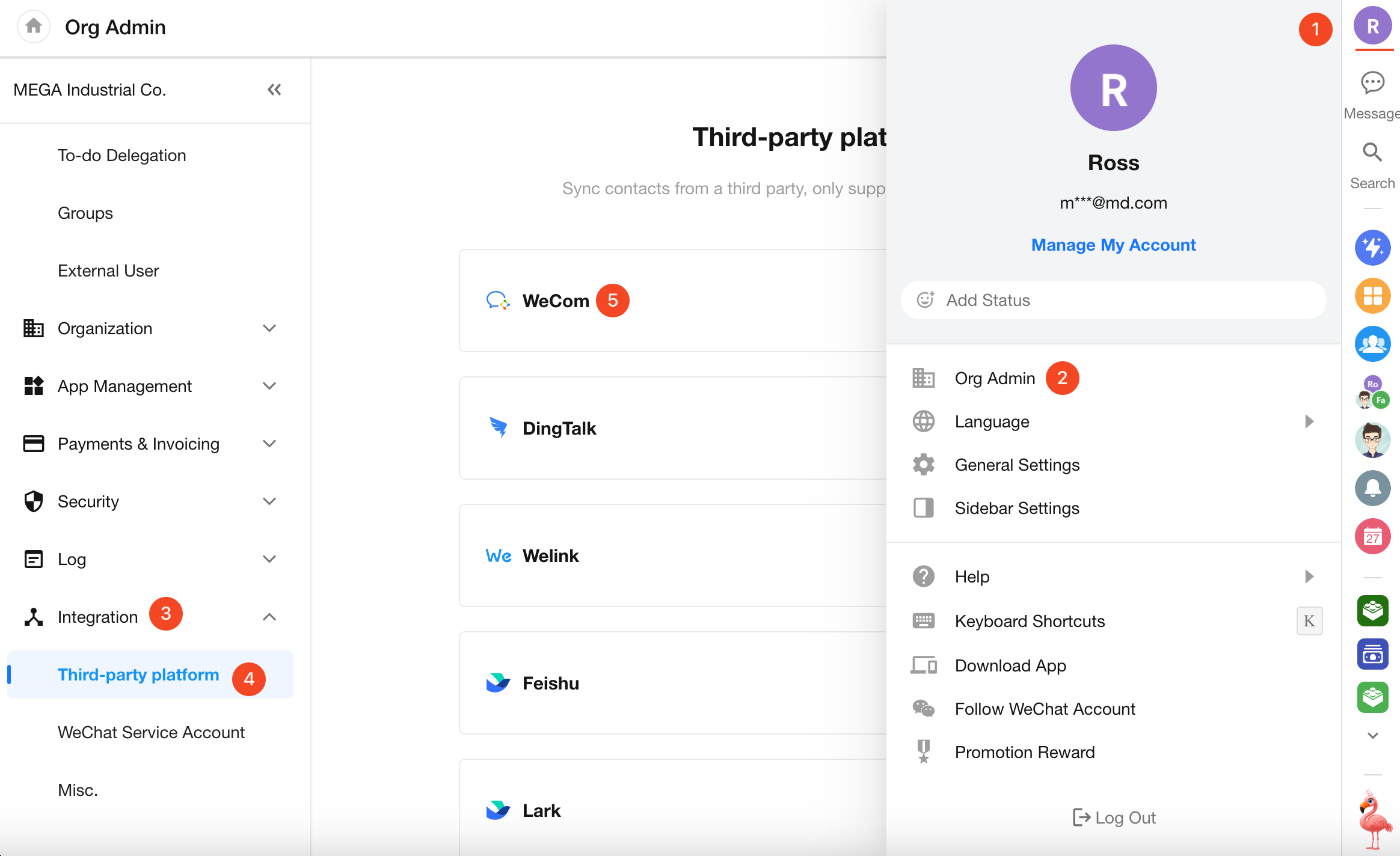 The integration with WeCom is implemented using a delegated development model. API call fees may be incurred during: Contacts synchronization, message synchronization, and single sign-on (SSO).