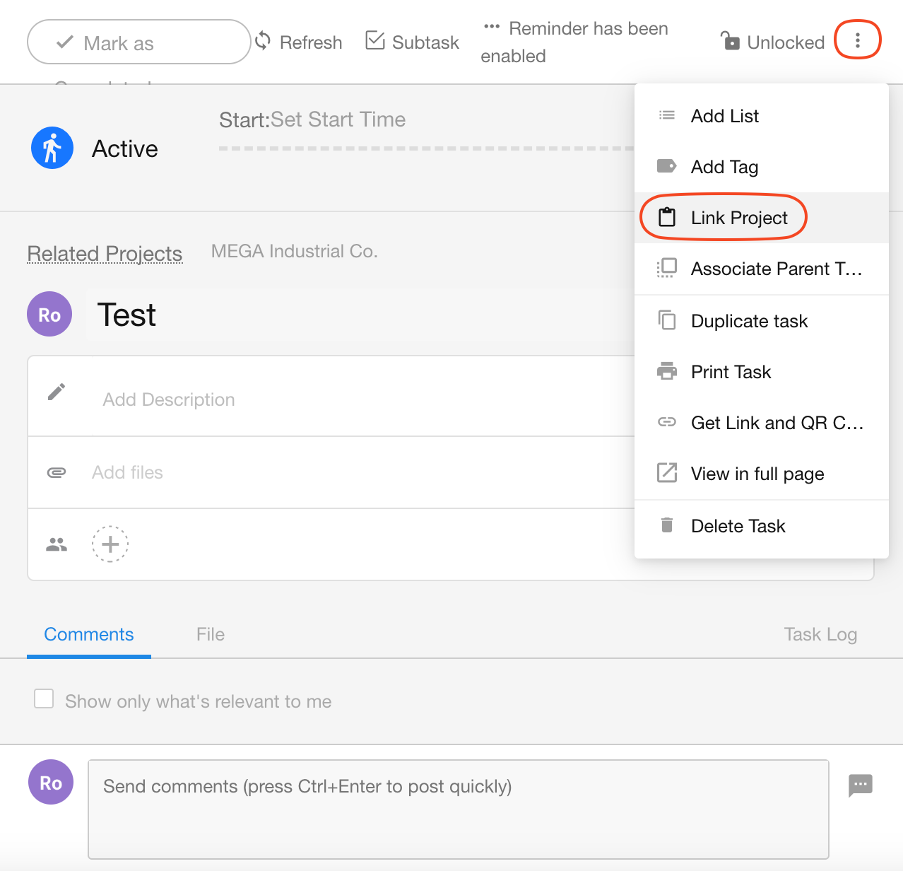 In the task details page, click the More button in the upper right corner, then select Link to Project.