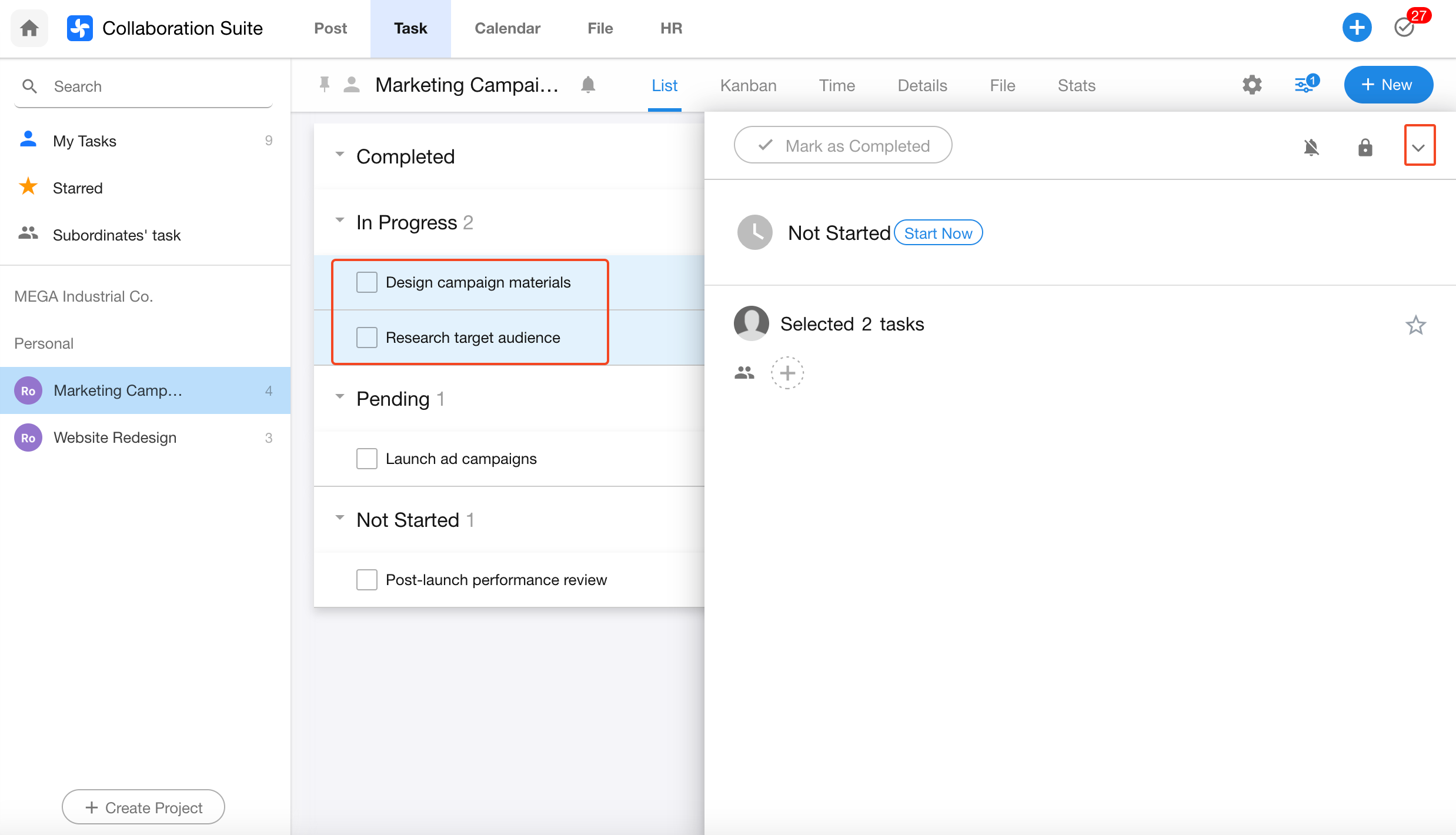 Hold the Ctrl key (Command on macOS) and click on multiple tasks. An action panel will appear on the right.