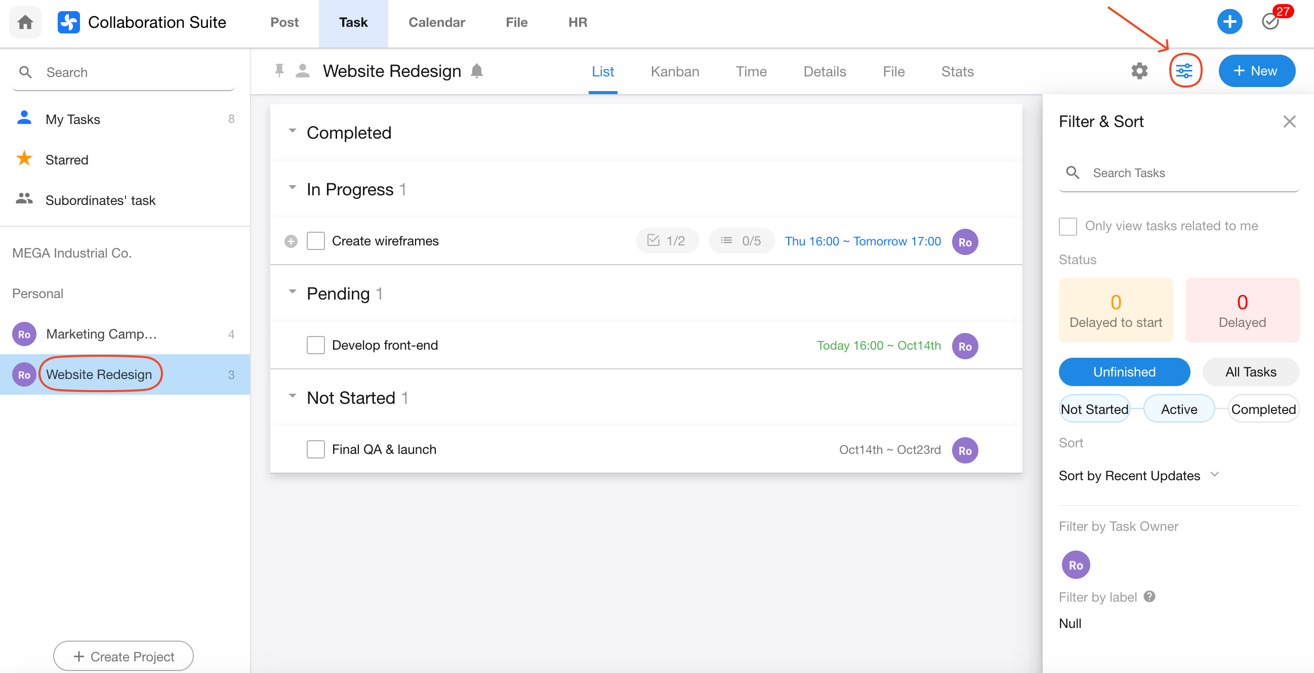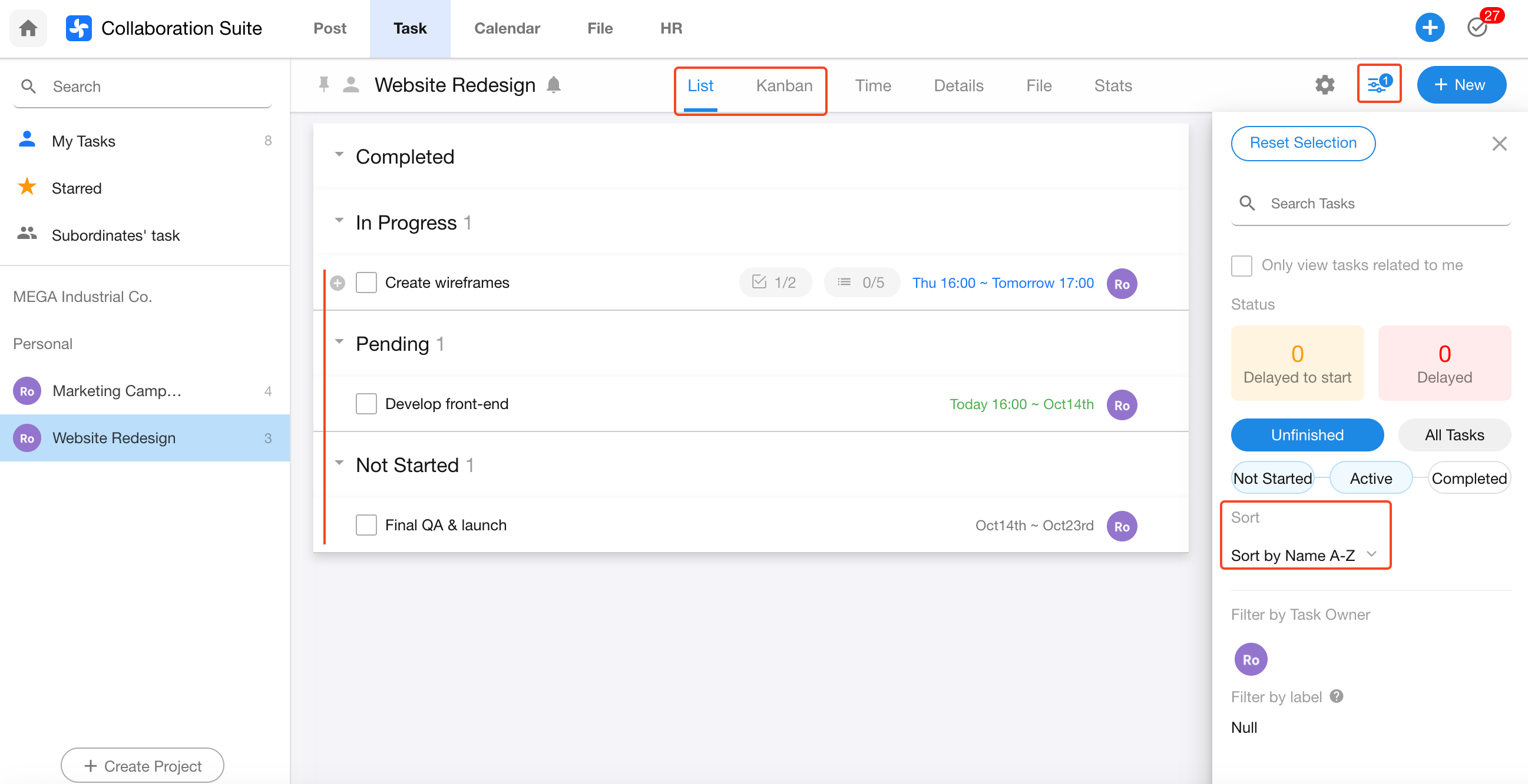 - Status: Filter tasks by whether they have started, are completed, or are overdue.