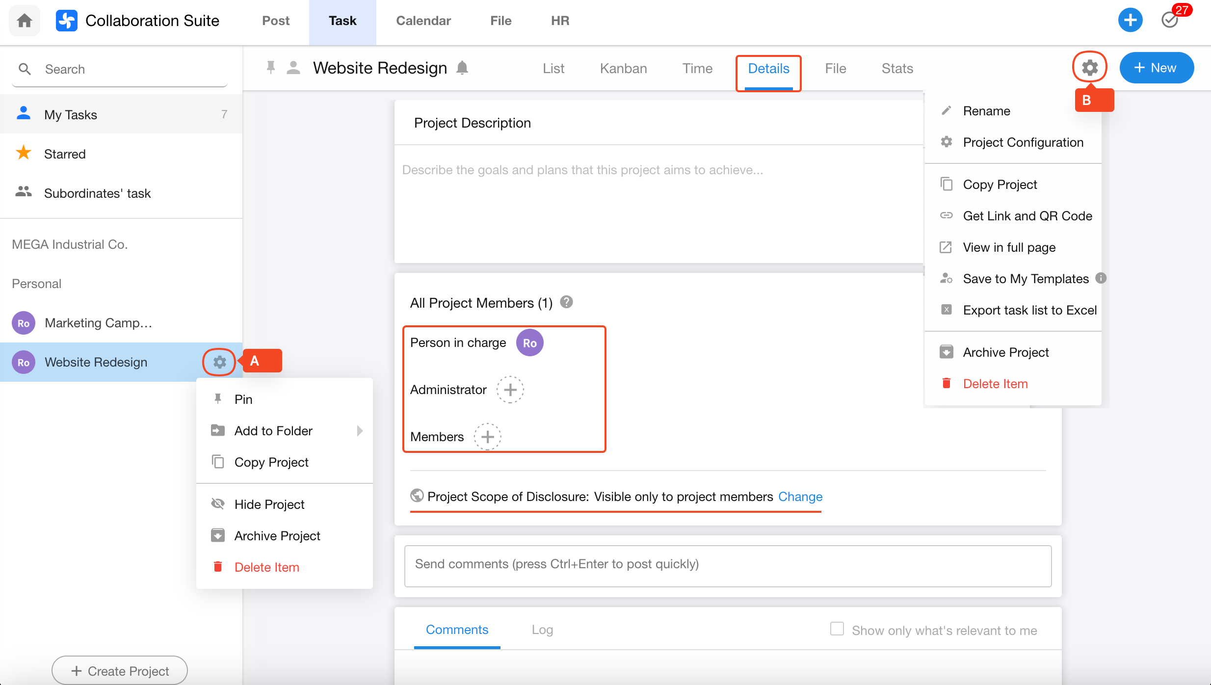 Option 2: In the left project list, when hovering over a project name, click Settings A to perform the following actions: