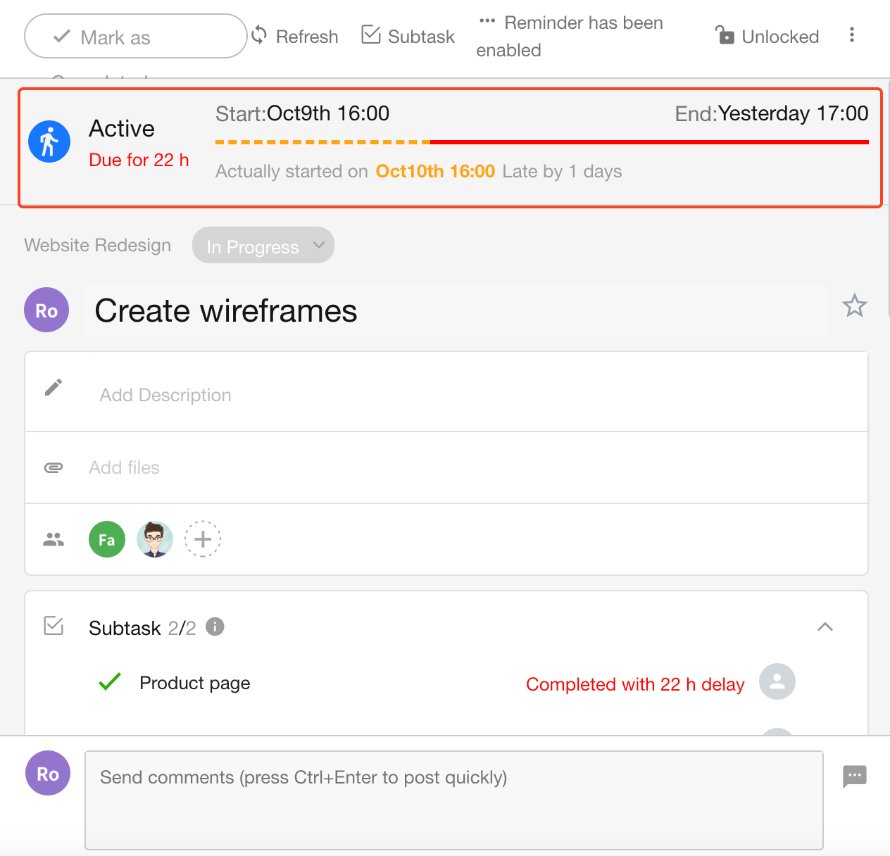 Users can set planned start/end times and actual start/end times for each task. These will be displayed in the task details page.
